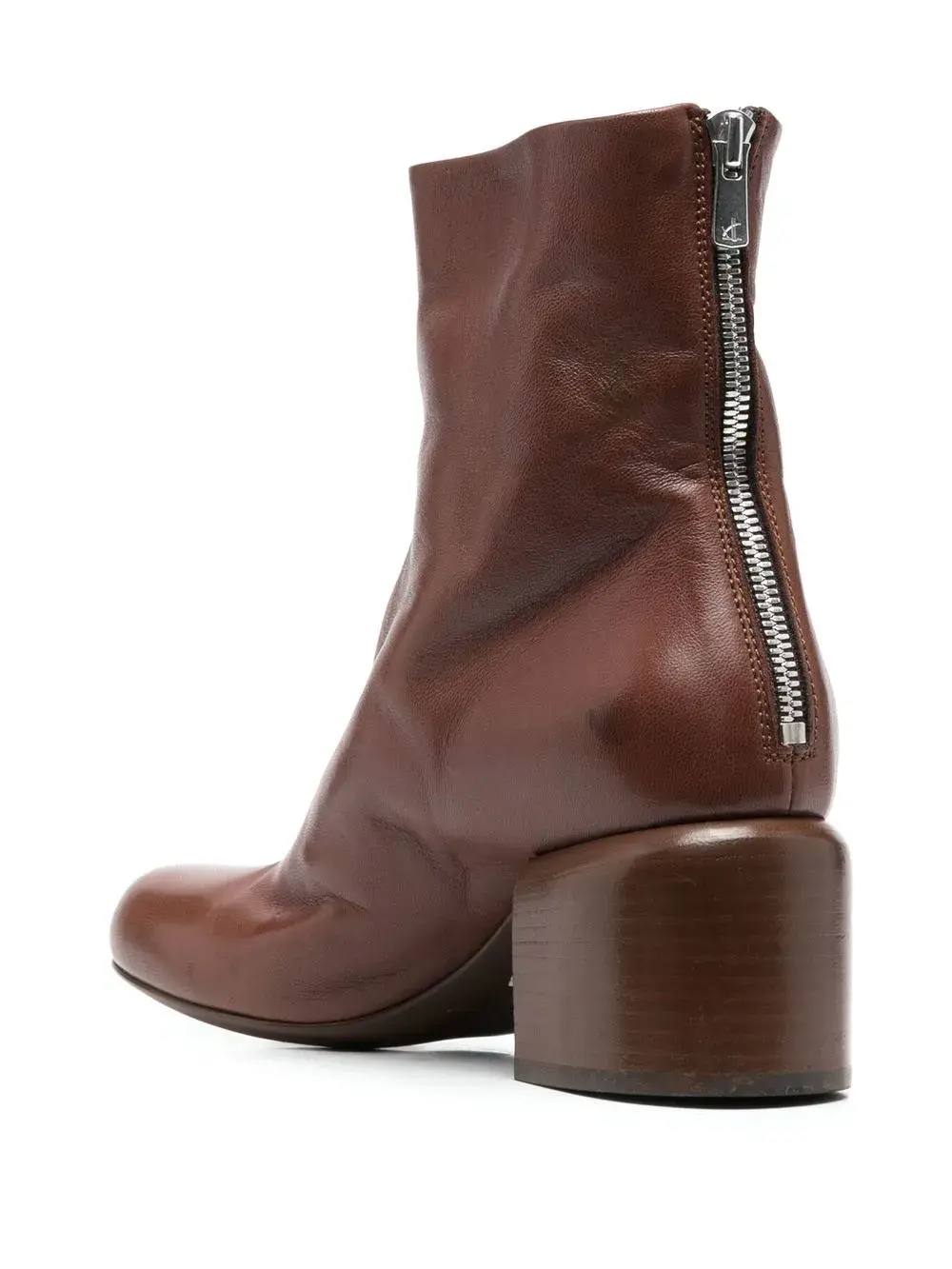 Темно-коричневый, телячья кожа, длина по щиколотку, застежка на молнии сзади, закругленный носок и наборный каблук средней высоты.