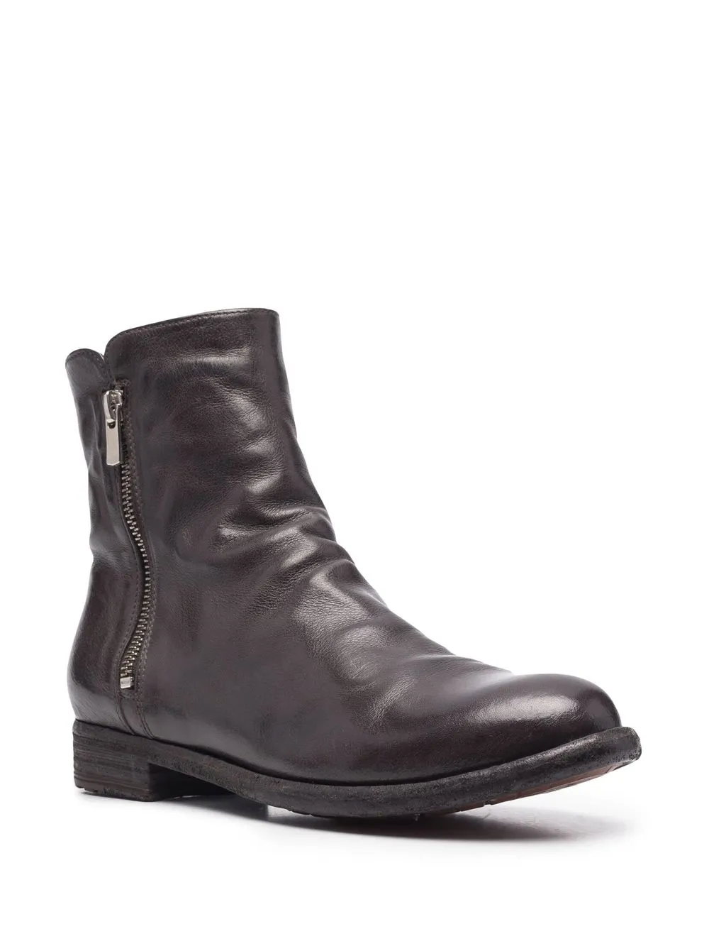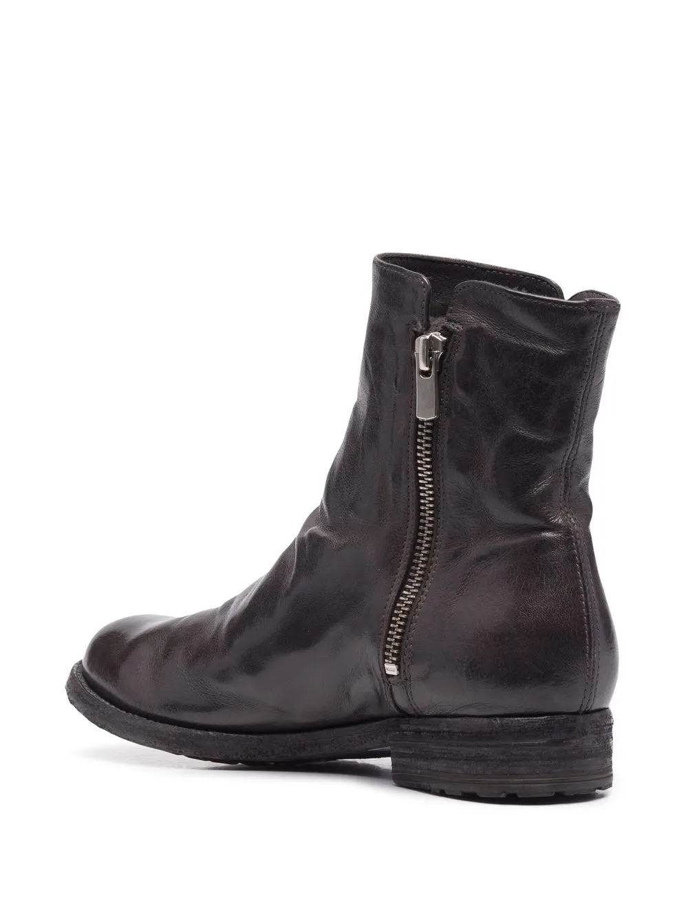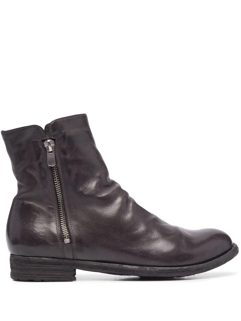 Темно-коричневый, кожа, длина по щиколотку, застежки на молнии сбоку, закругленный носок и плоская резиновая подошва.