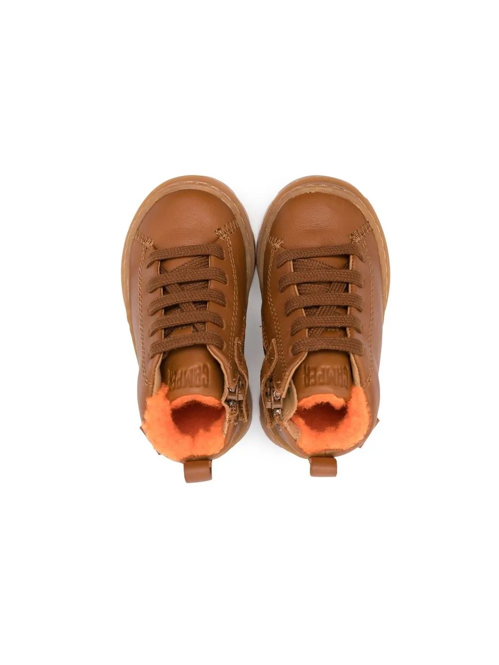 Коричневый, кожа, переработанный ПЭТ, строчка в тон, нашивка с логотипом сбоку, шнуровка спереди, тисненый логотип на язычке, петля для подтягивания сзади, закругленный носок, подкладка из шерпы, высота по щиколотку, стелька с логотипом и плоская резиновая подошва.