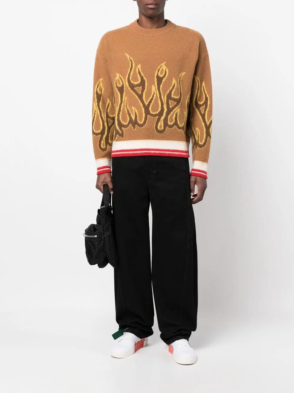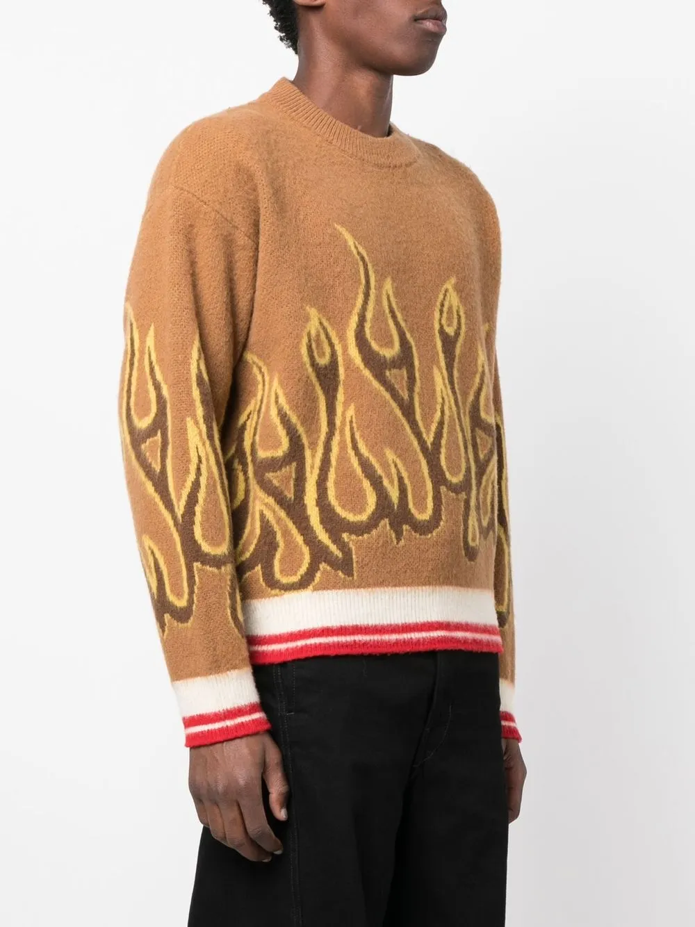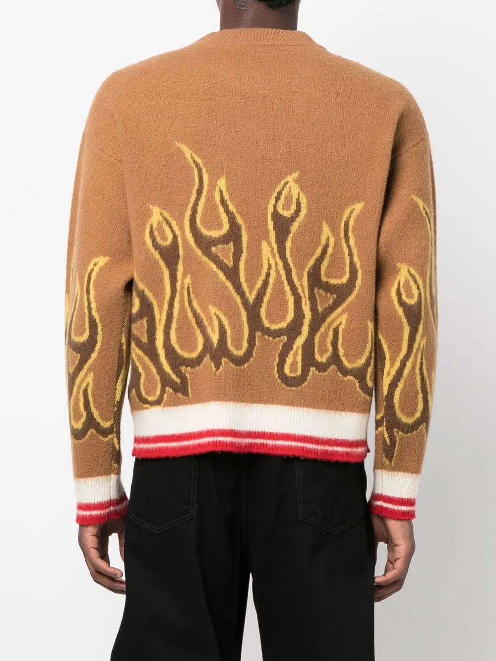 Необработанная шерсть, коричневый, круглый вырез, приспущенные плечи, принт с изображением пламени, длинные рукава, края в рубчик и края в полоску.
