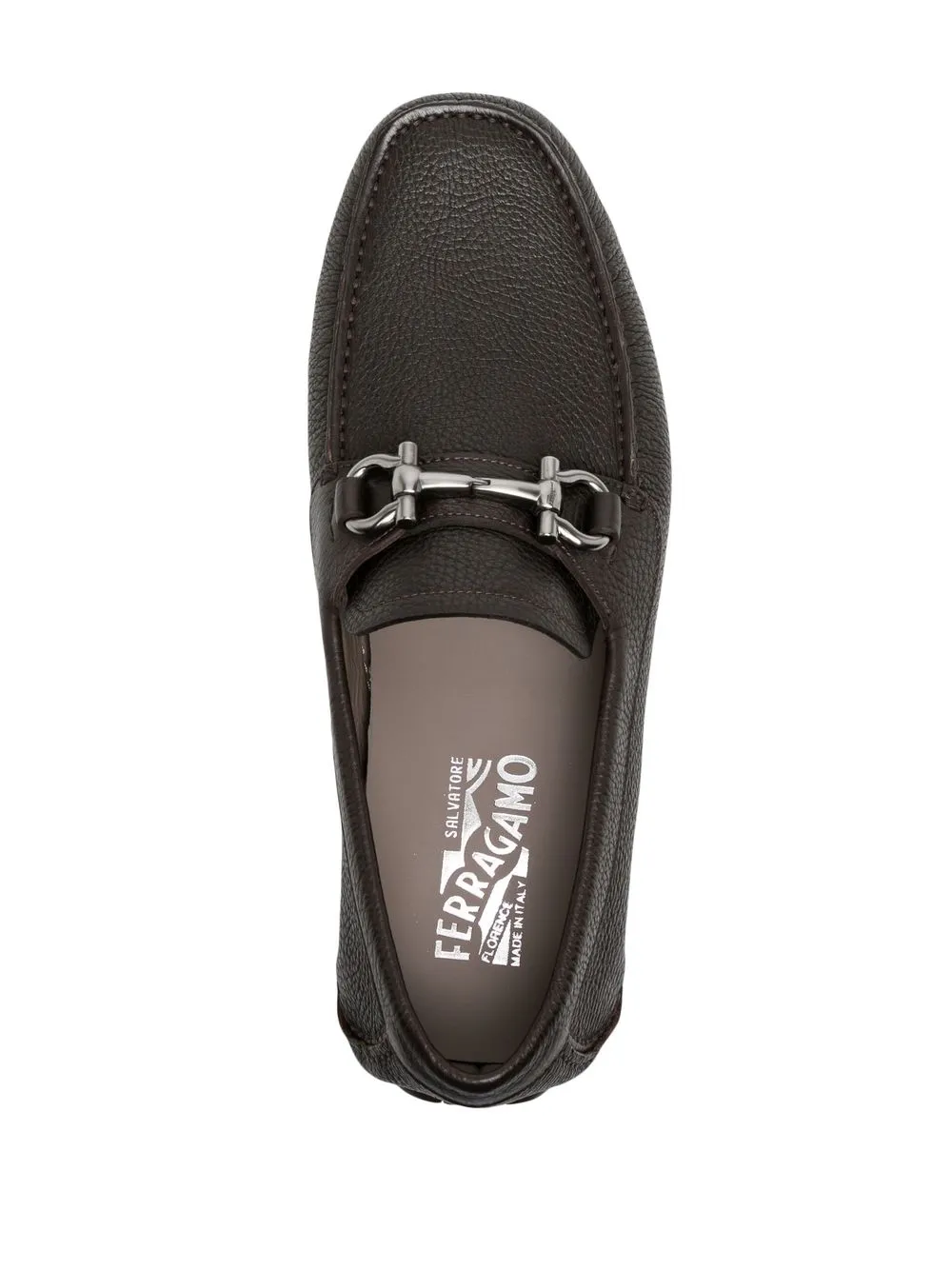 Коричневый, кожа, зернистая текстура, знаковый декор Horsebit, серебристая фурнитура, квадратный носок, кожаная подкладка, кожаная стелька с логотипом, резиновая подошва и модель без застежки.
