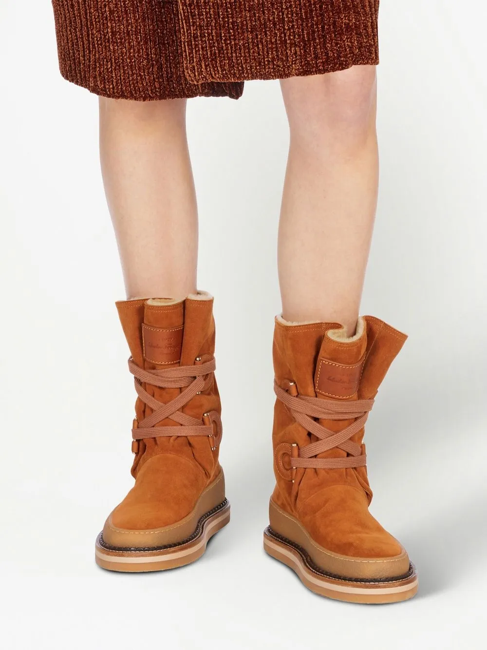 Коричневый, замша из телячьей кожи, длина до середины голени, пряжка Gancini, закругленный носок, шнуровка спереди и резиновая подошва.
