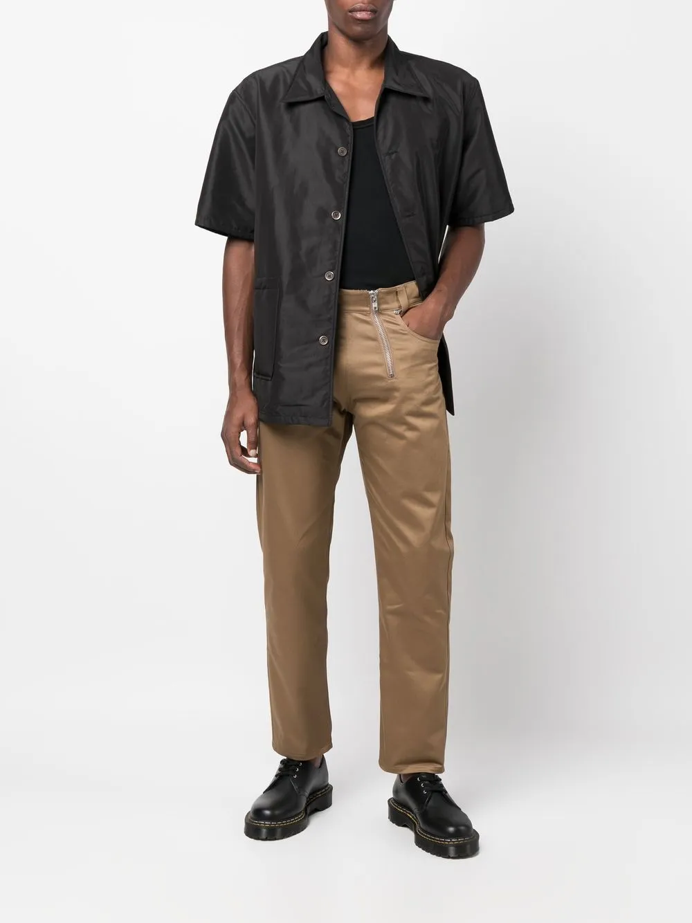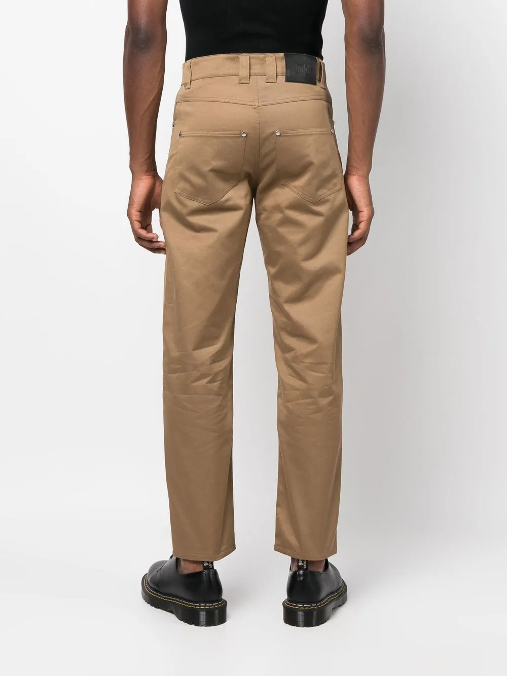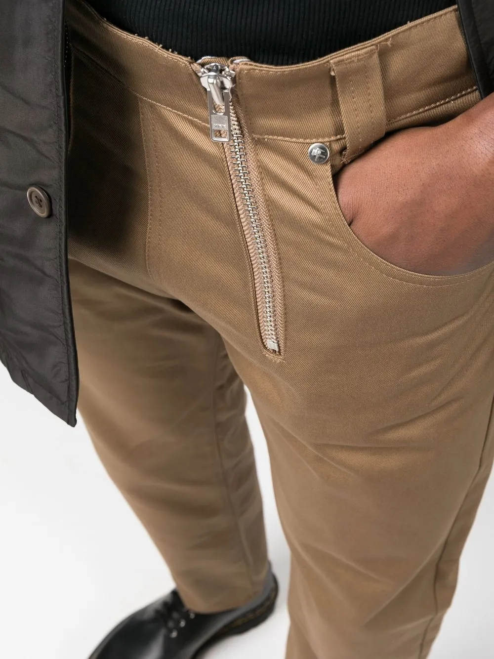 Бежево-коричневый, хлопок, нашивка с логотипом сзади, детали с молниями, прямой крой, средняя посадка, потайная застежка на молнии и пуговицах, пять карманов и петли для ремня.