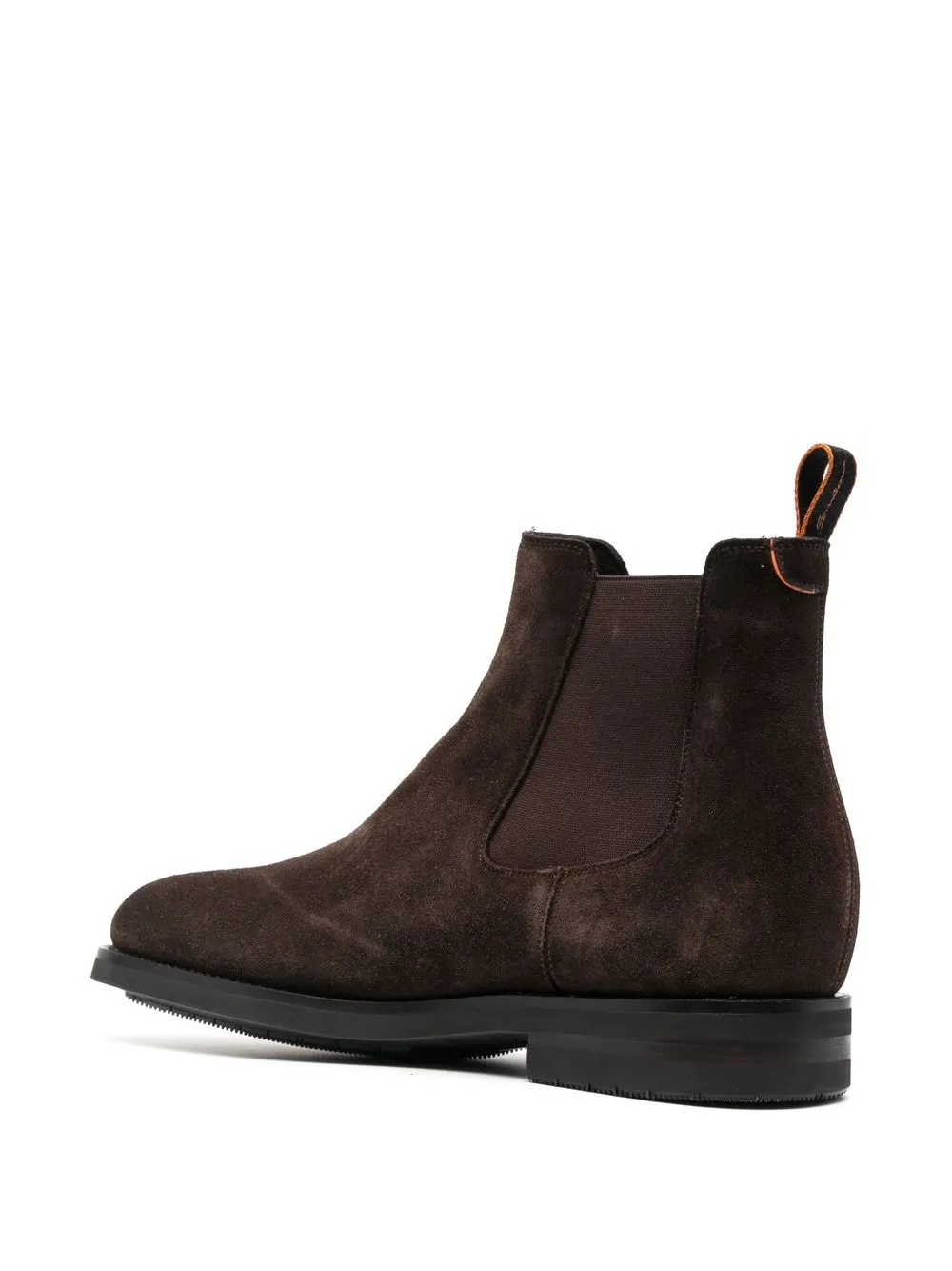Коричневый, замша, плоская резиновая подошва, эластичные боковые вставки, петля для подтягивания сзади и миндалевидный носок.