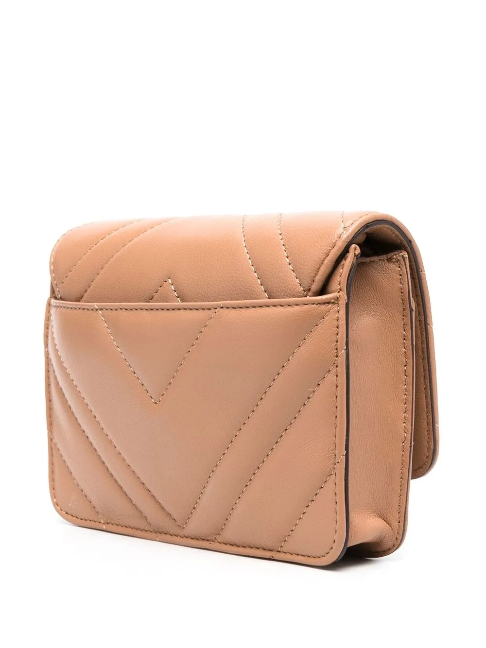 Золотистая фурнитура, золотистый металлический логотип, стеганая отделка, откидной клапан на магните, основное отделение, внутренний карман на молнии, нашивка с логотипом внутри, подкладка с логотипами и ремень на плечо с цепочной деталью.