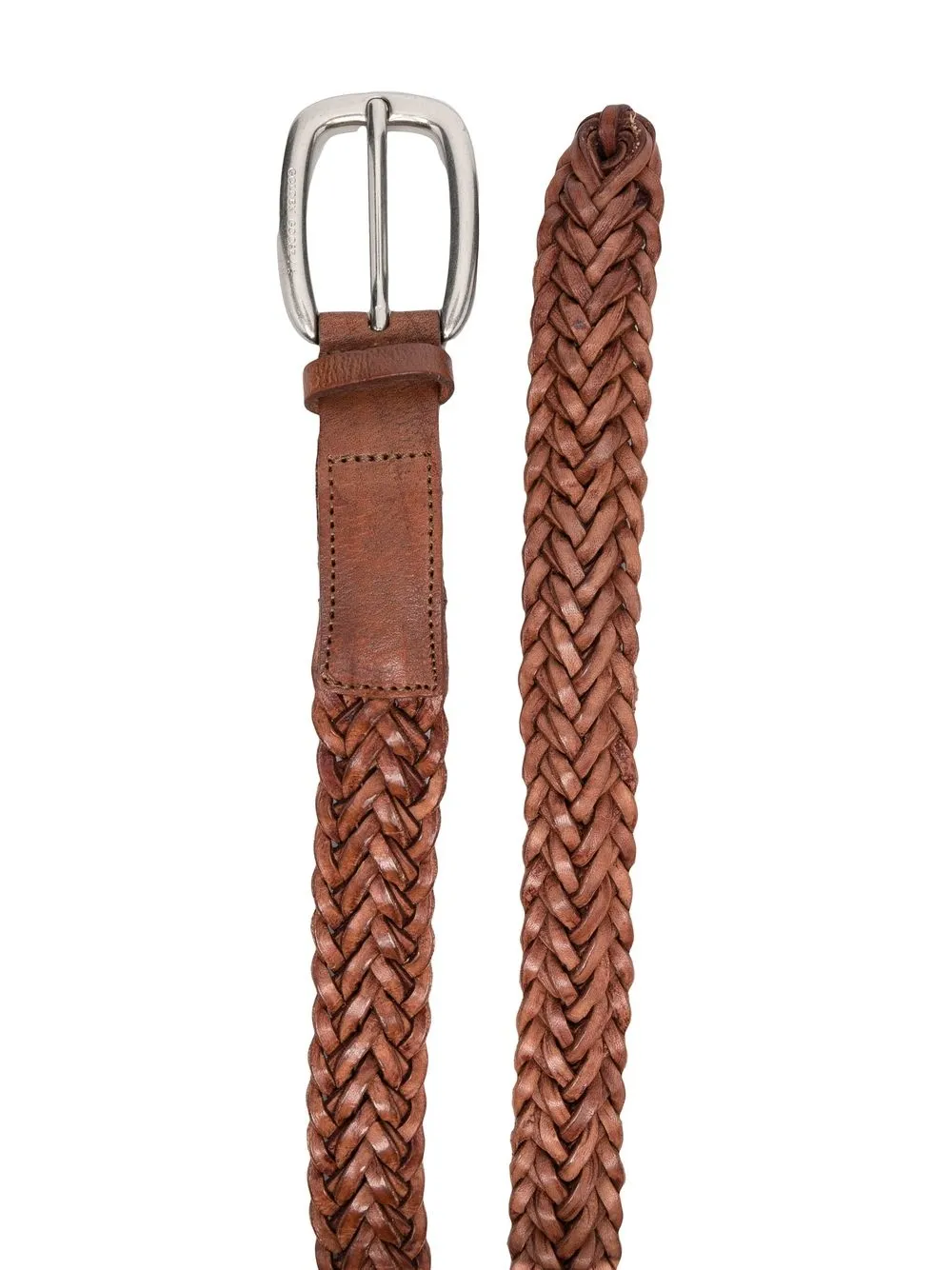 Расцветка Tobacco Brown, телячья кожа, переплетенный дизайн, выгравированный логотип и застежка на серебристой пряжке.
