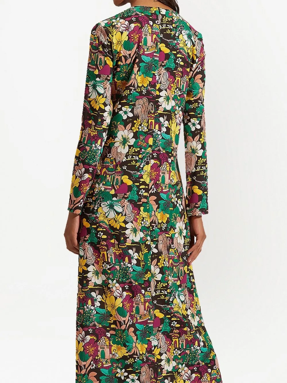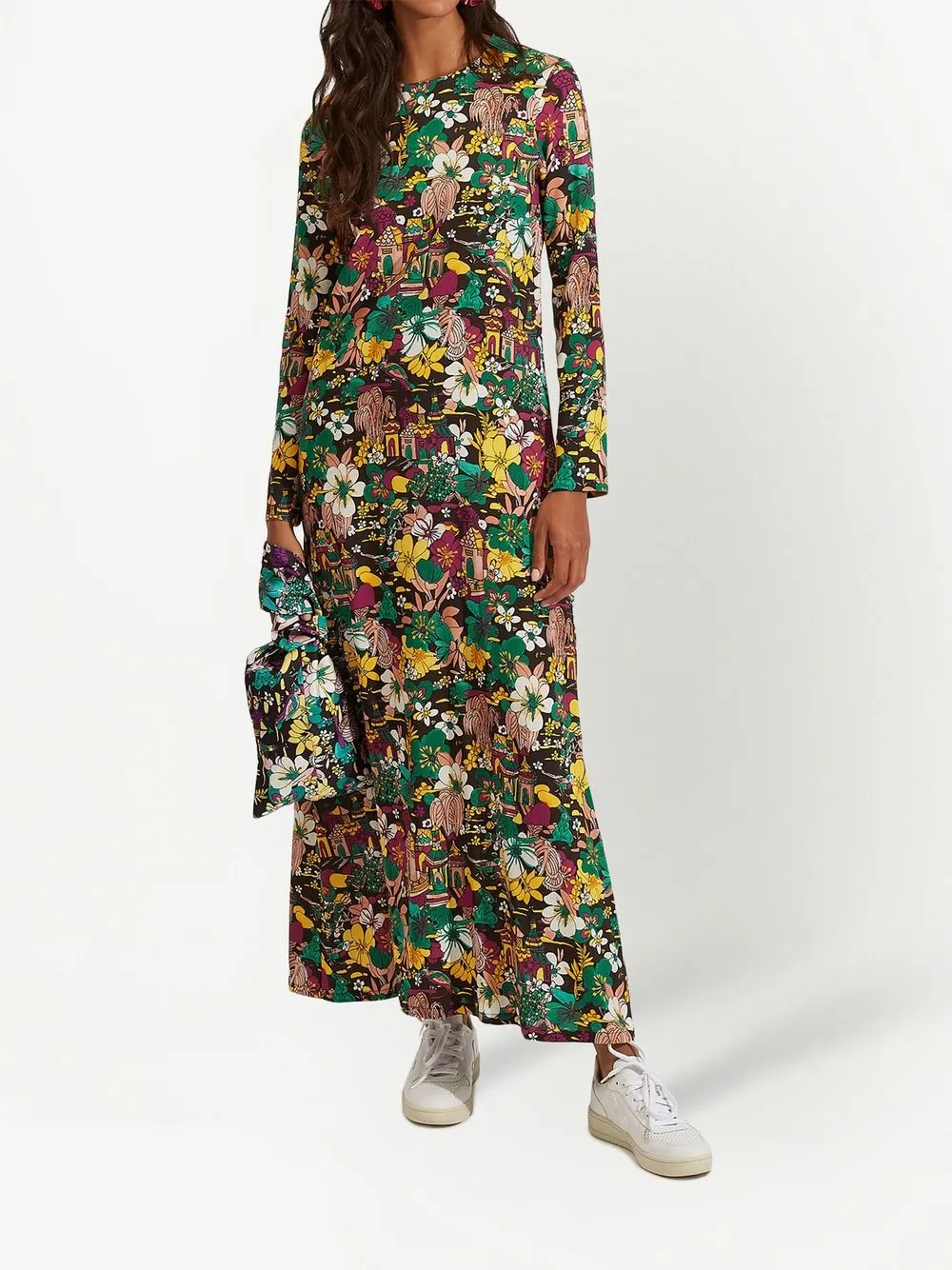 Разноцветный, сплошной цветочный принт, круглый вырез, потайная застежка на молнии сзади, длинные рукава, прямой подол и высота по щиколотку.