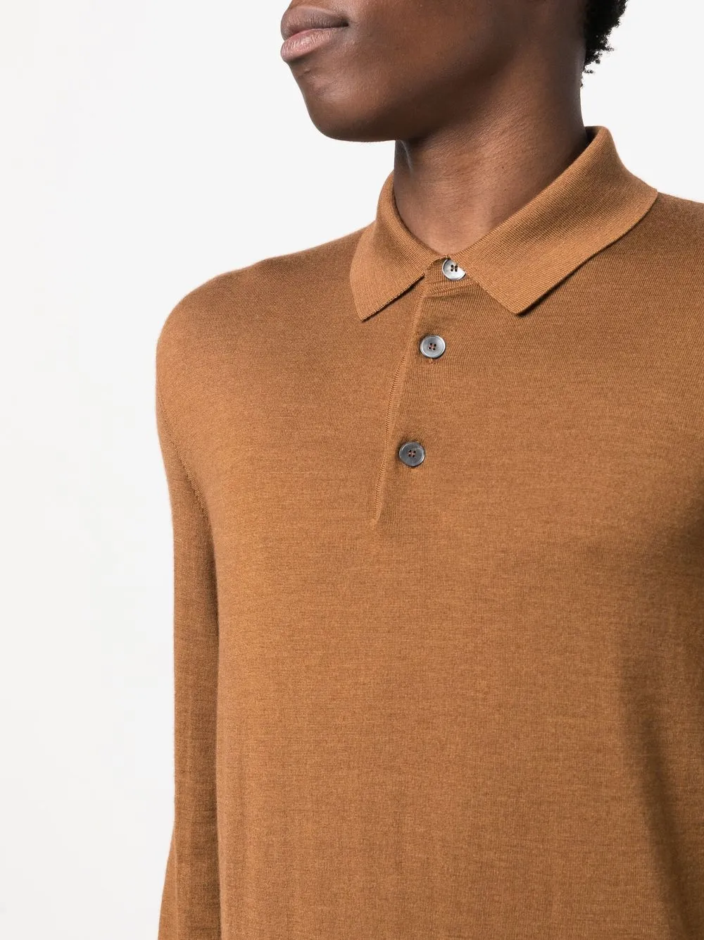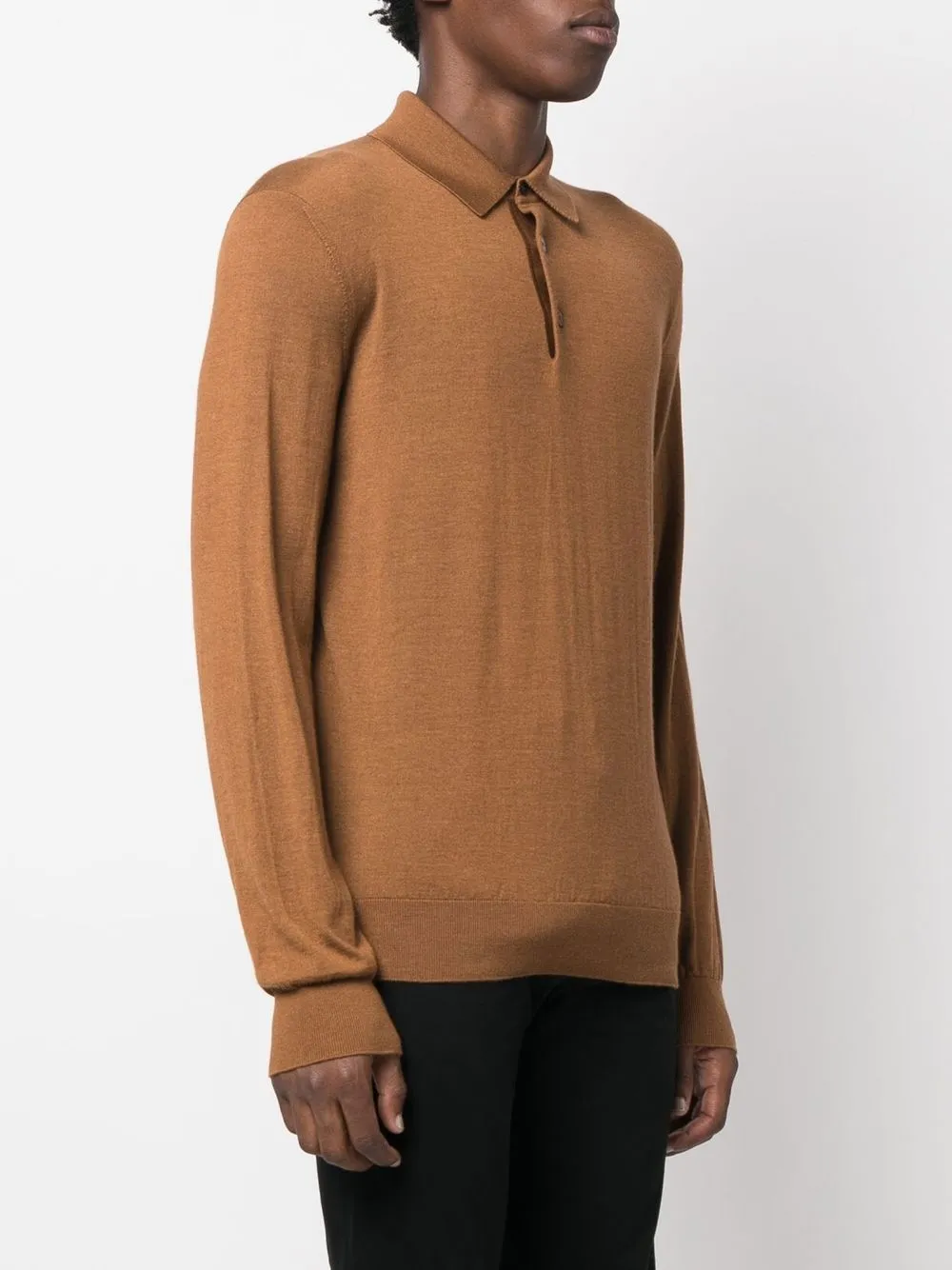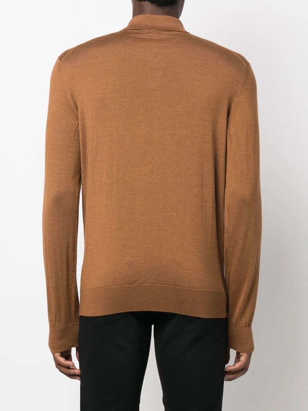 Коричневый смесь кашемира и шелка тонкая вязка воротник поло короткая застежка на пуговицах спереди длинные рукава манжеты в рубчик подол в рубчик