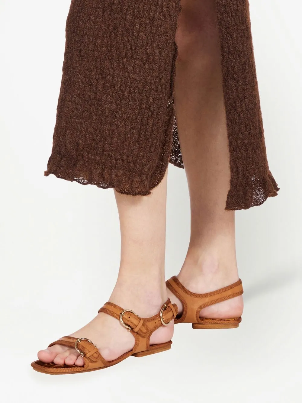 Коричневый, телячья кожа, застежка на пряжке, открытый носок, ремешок на пятке и плоская кожаная подошва.