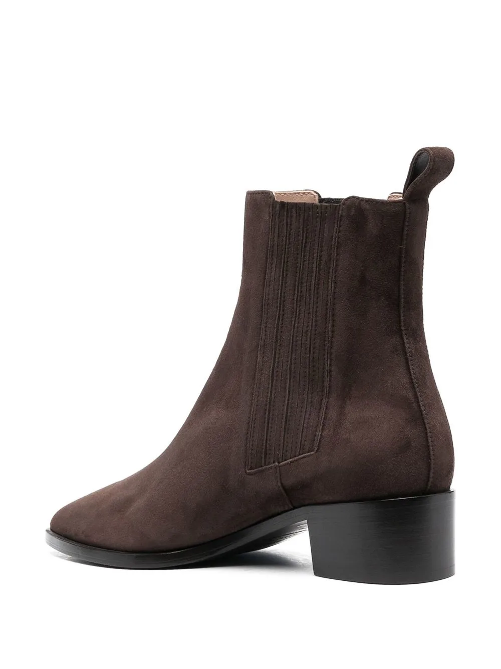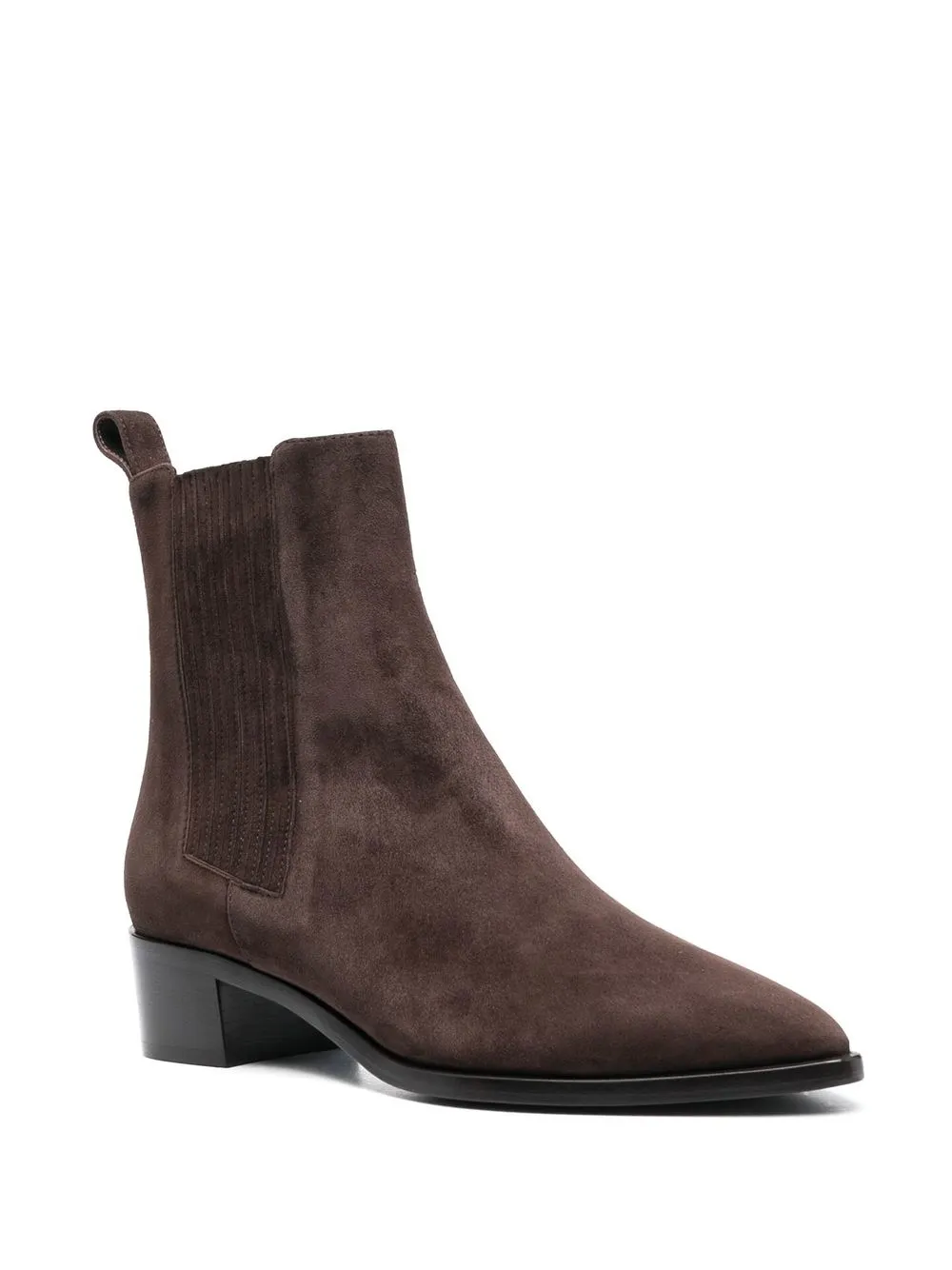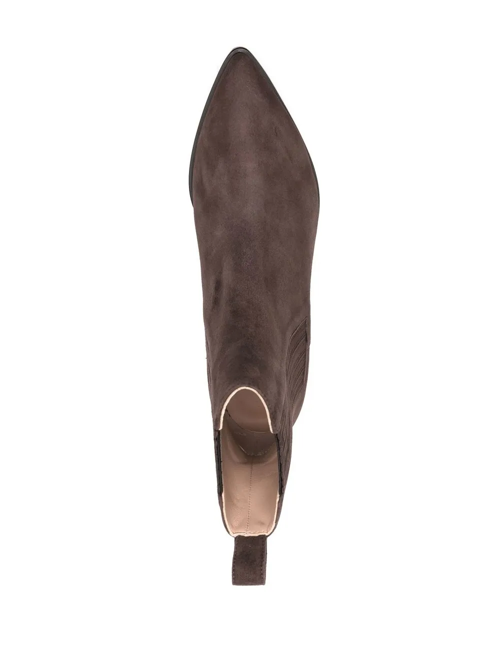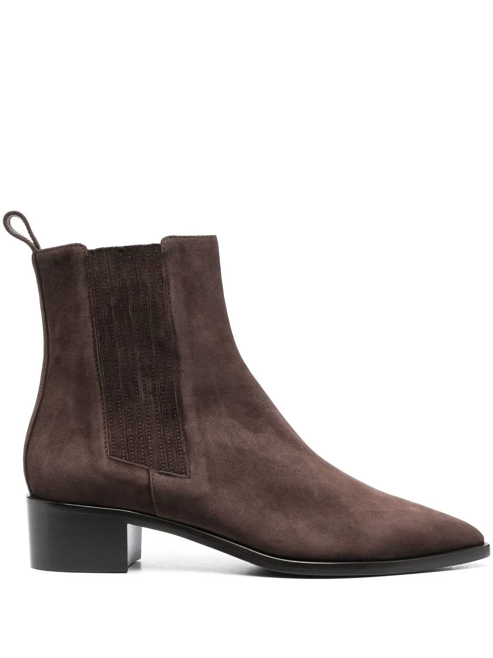 Шоколадный, замша из телячьей кожи, телячья кожа, эластичные боковые вставки, заостренный носок, петля для подтягивания сзади, кожаная стелька с логотипом, низкий блочный каблук, высота по щиколотку и модель без застежки.