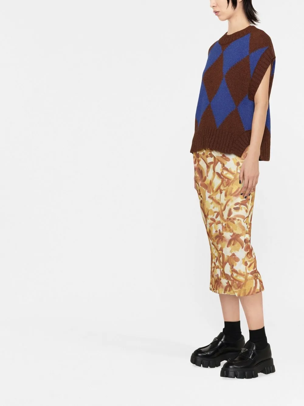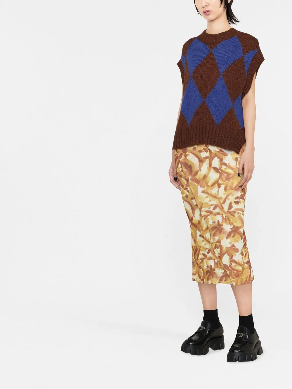 Смесовая шерсть альпаки, вязка аргайл, круглый вырез, без рукавов и подол в рубчик.