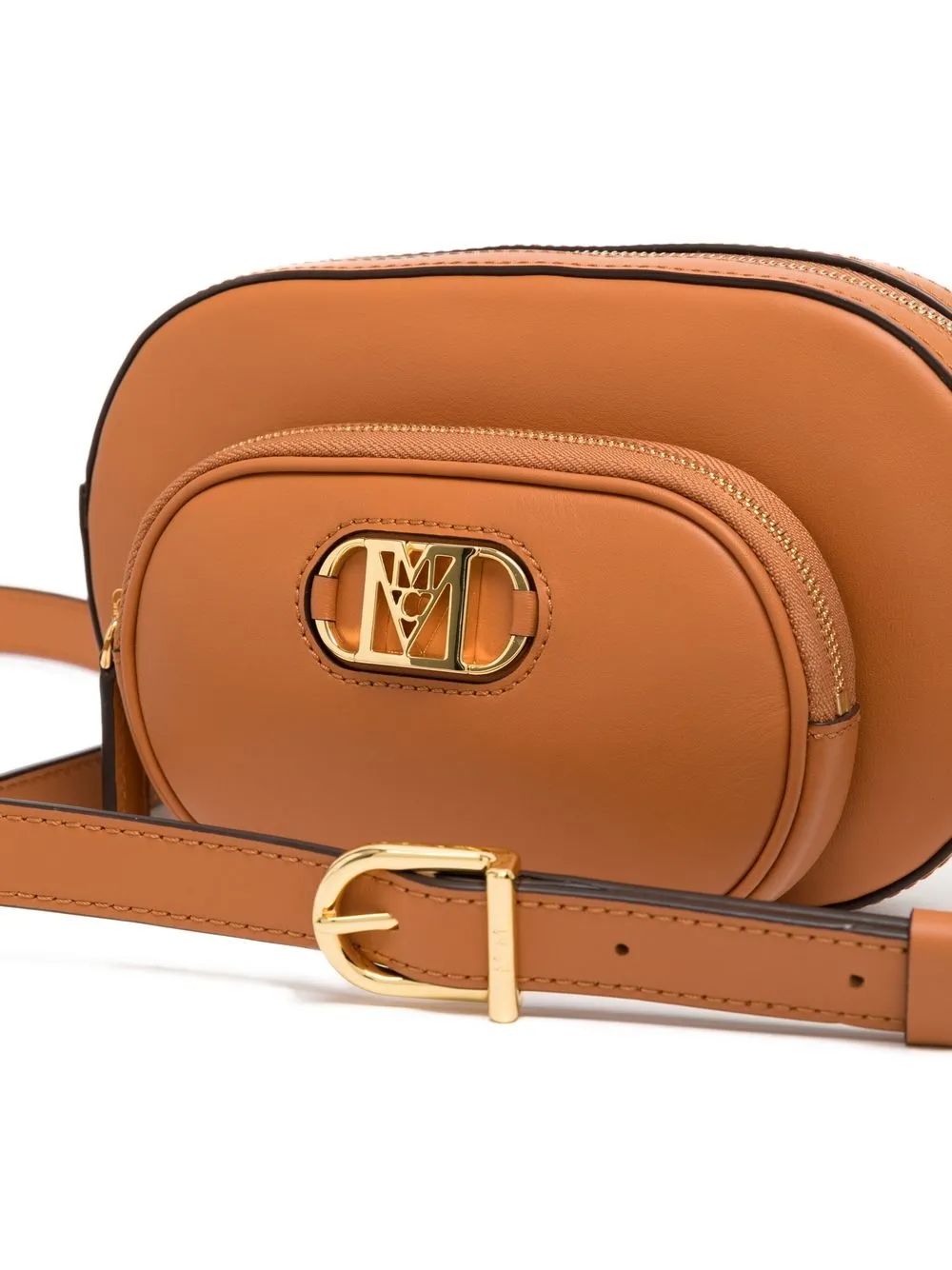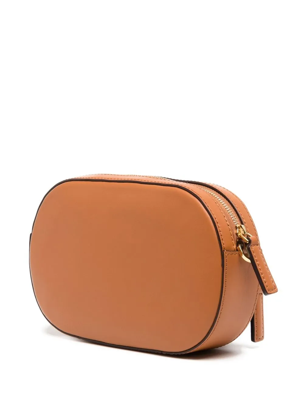 Коньячный коричневый, кожа, золотистый металлический логотип, застежка на молнии сверху, передний карман на молнии и ремень на плечо.