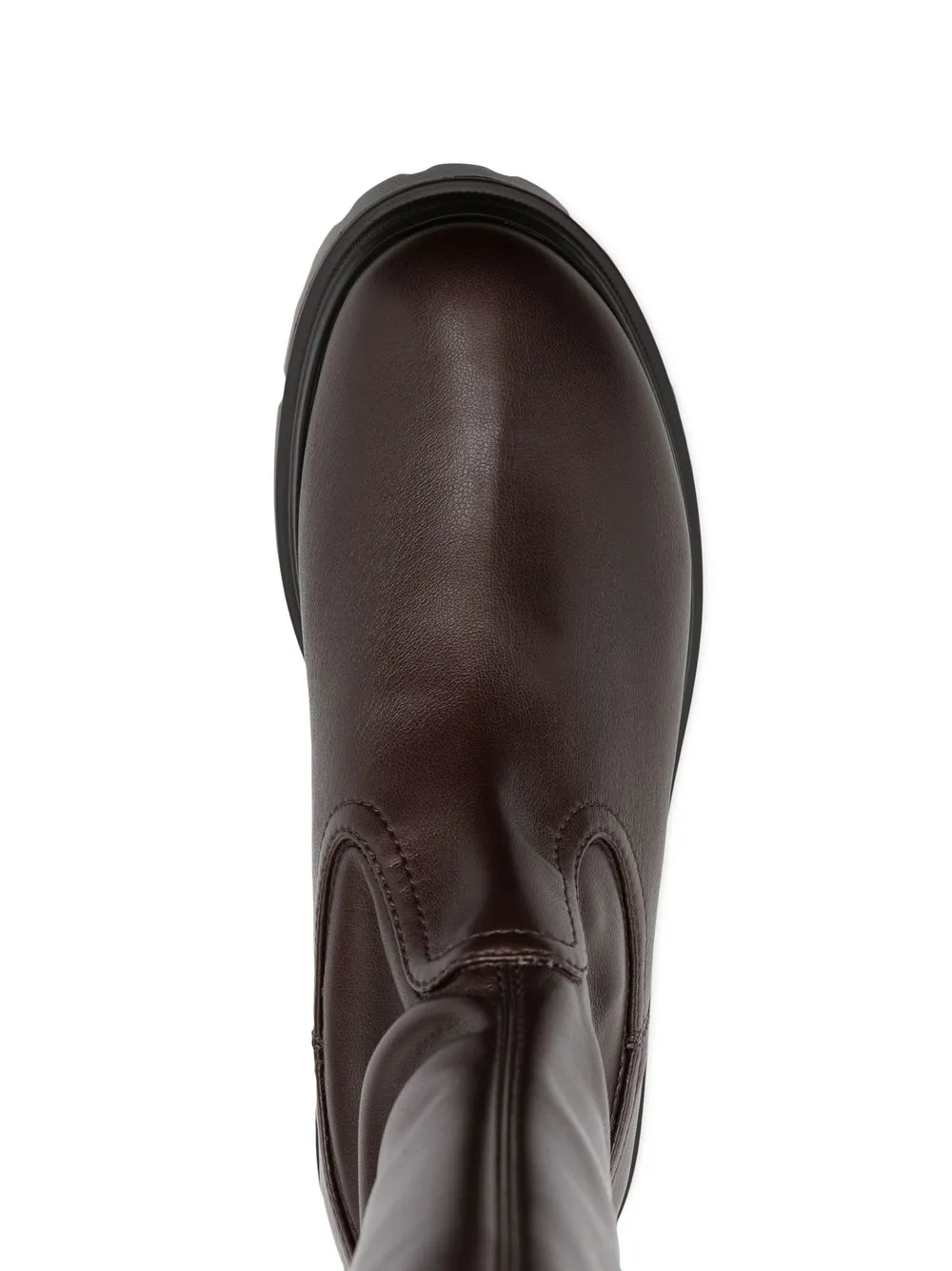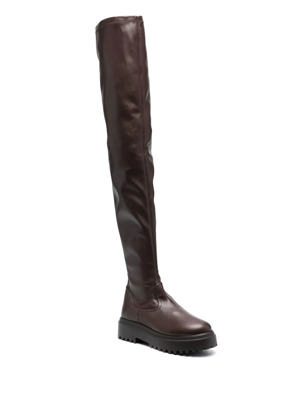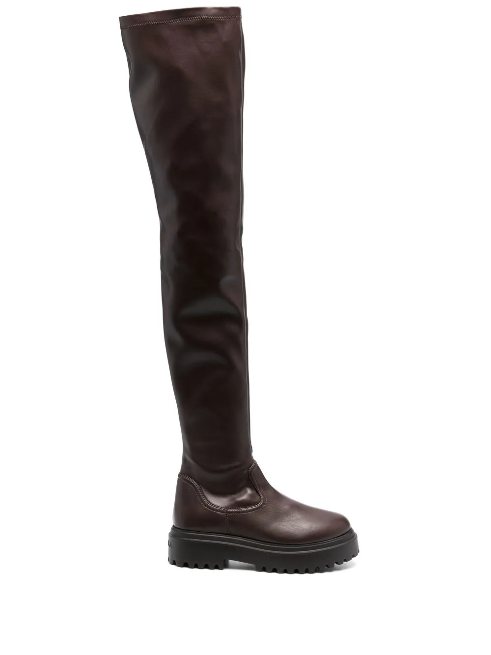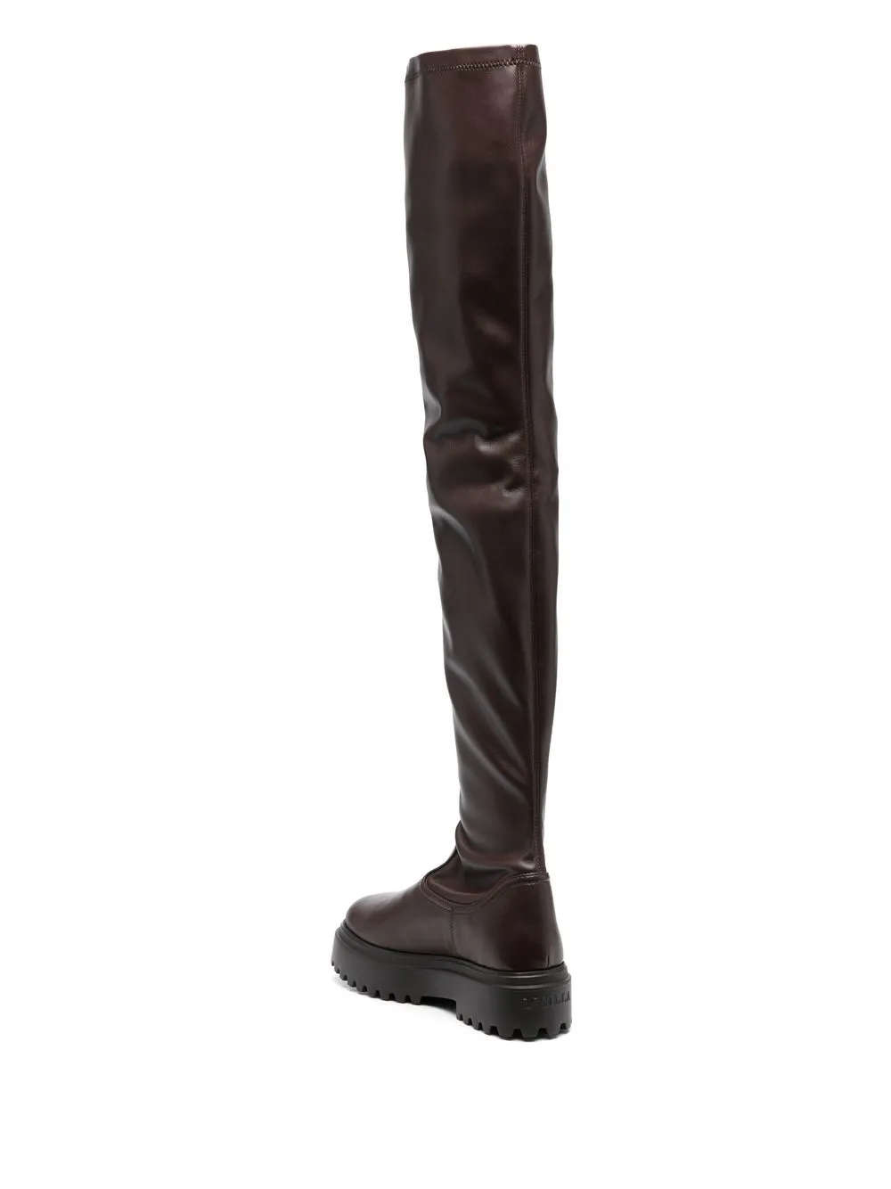 Коричневый, козья кожа, телячья кожа, закругленный носок, длина до бедер, модель без застежки, низкий каблук, стелька с логотипом и массивная резиновая подошва c протектором.