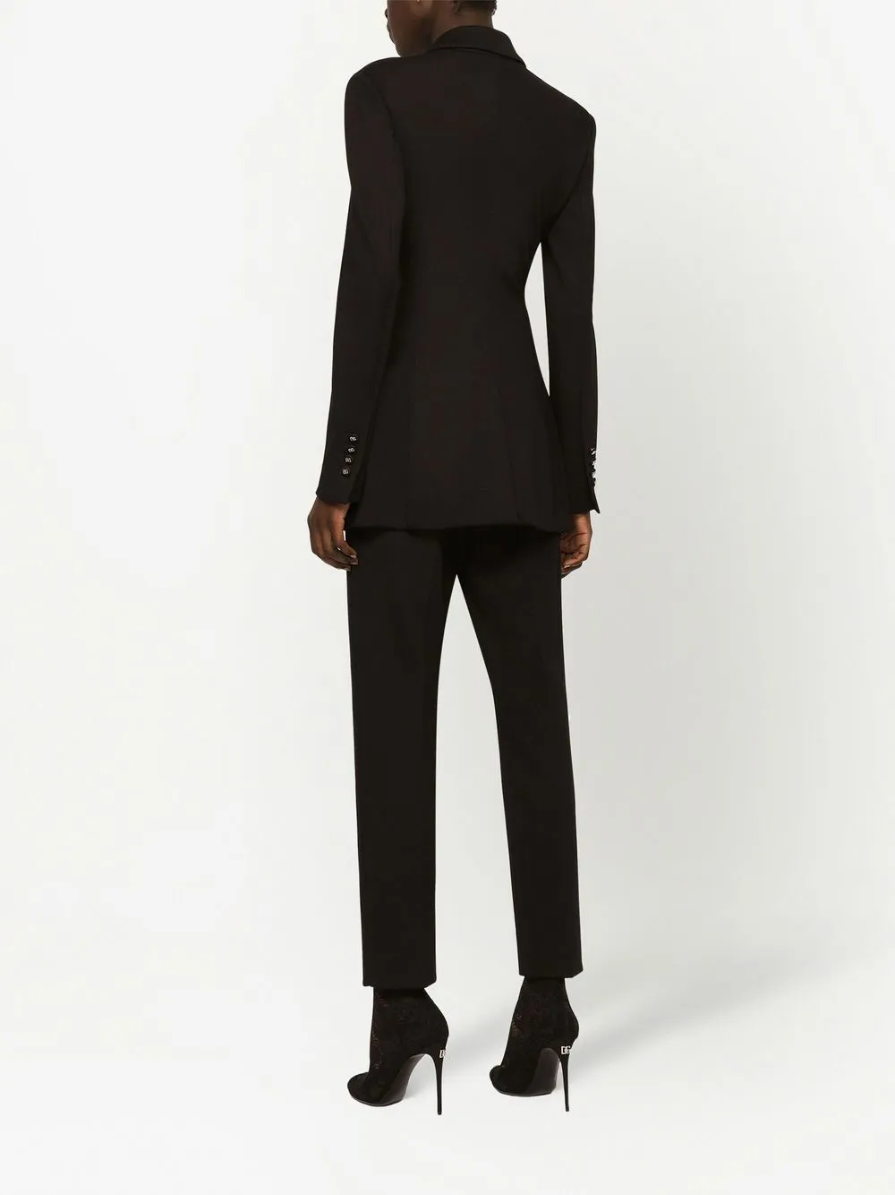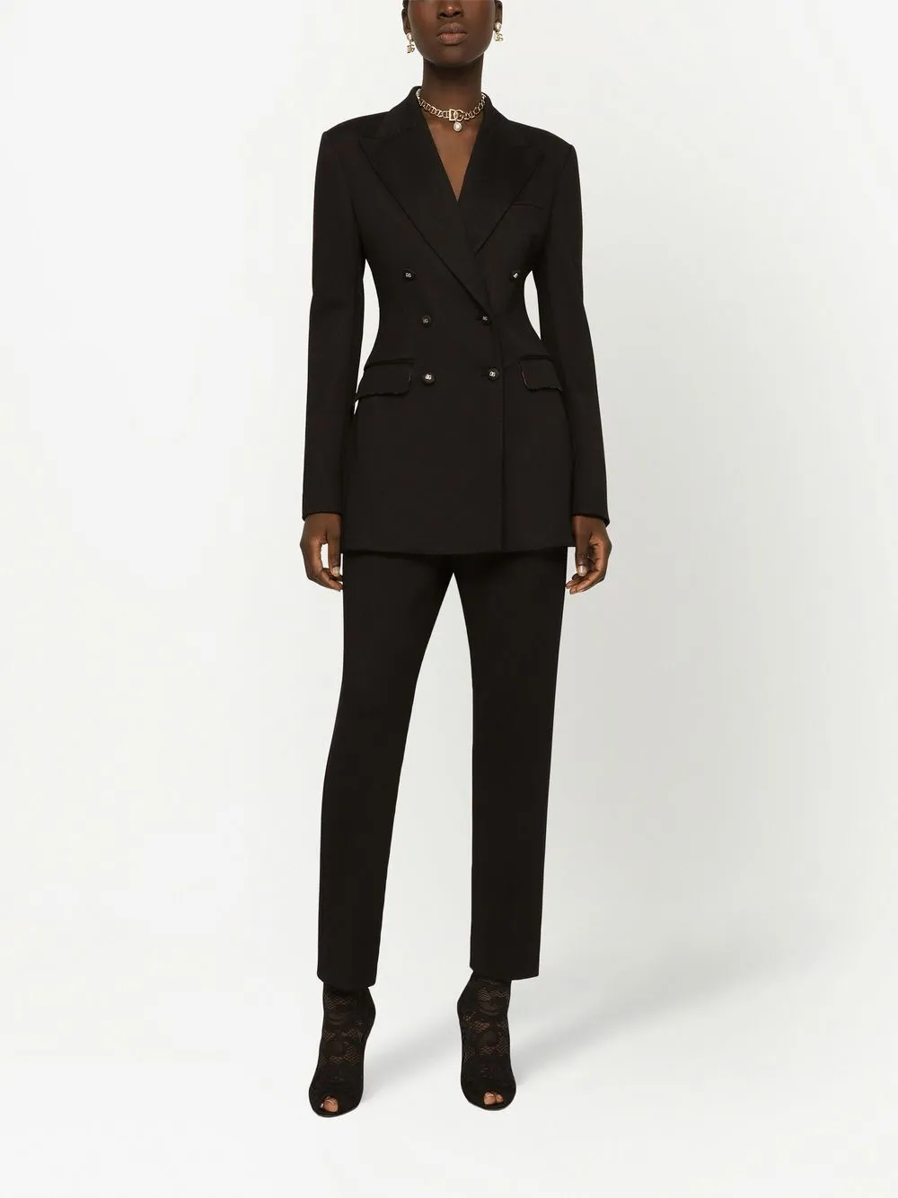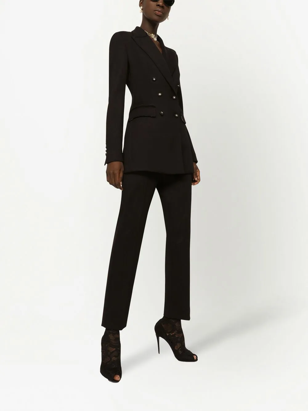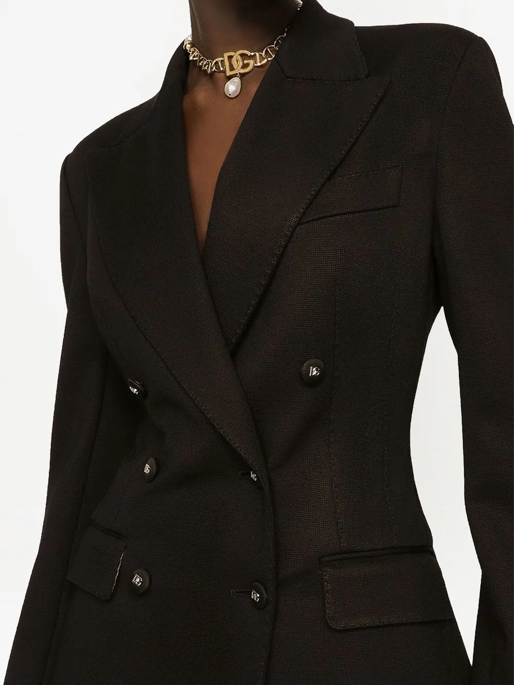 Черный, широкие заостренные лацканы, двубортная застежка на кнопки, пуговицы с тисненым логотипом, длинные рукава, два кармана с клапанами по бокам, прорезной карман на груди и подкладка с леопардовым принтом.