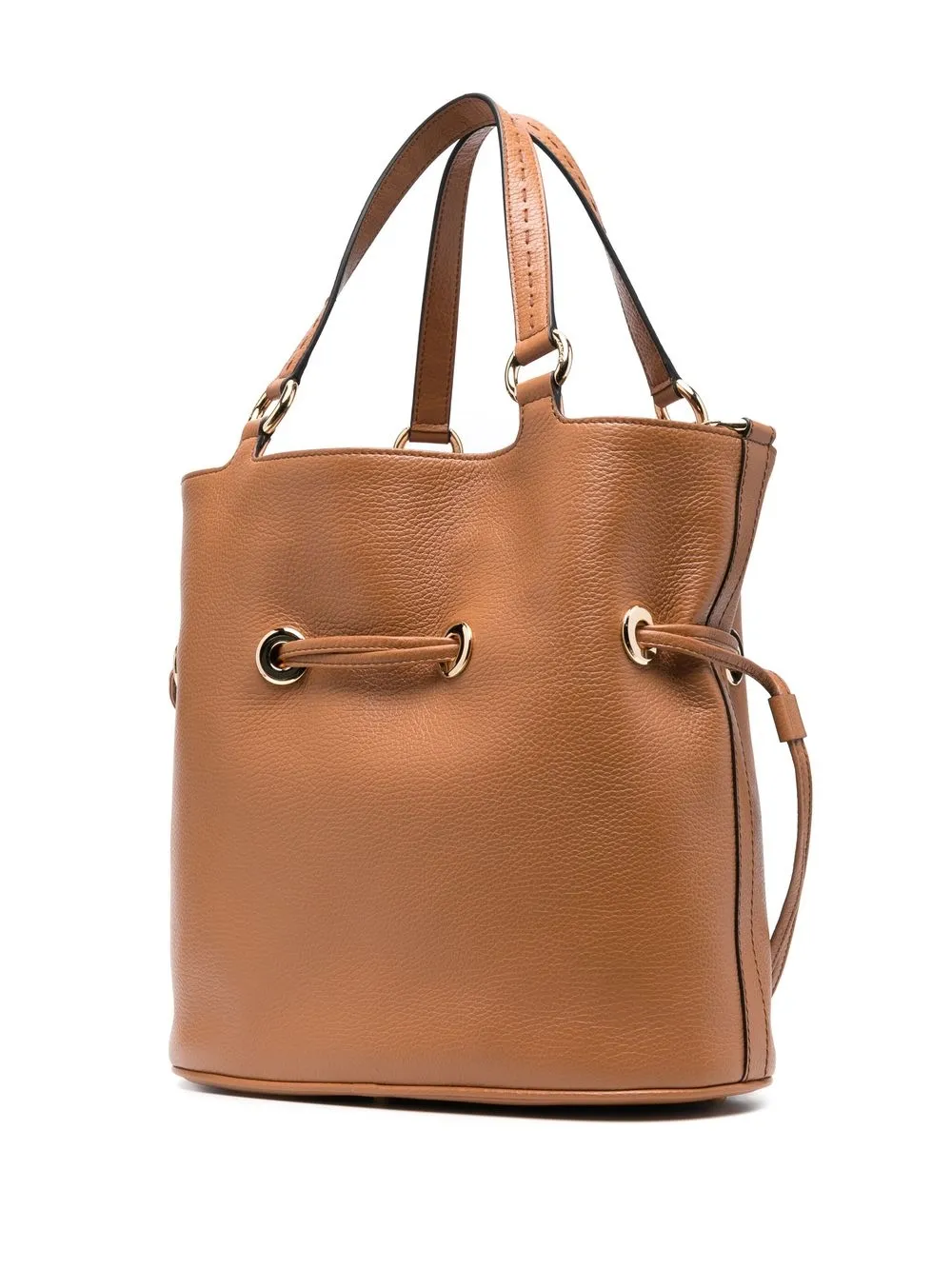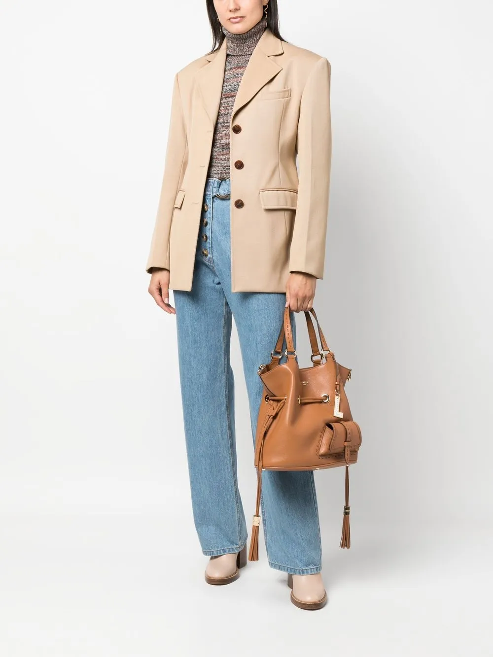 Бежево-коричневый, телячья кожа, подвеска с логотипом, тисненый логотип спереди, декоративные кисточки, две верхние ручки, съемный регулируемый ремень на плечо, кулиска, основное отделение, внутренний карман на молнии, нашивка с логотипом внутри, передний карман с клапаном, металлические ножки и золотистая фурнитура.