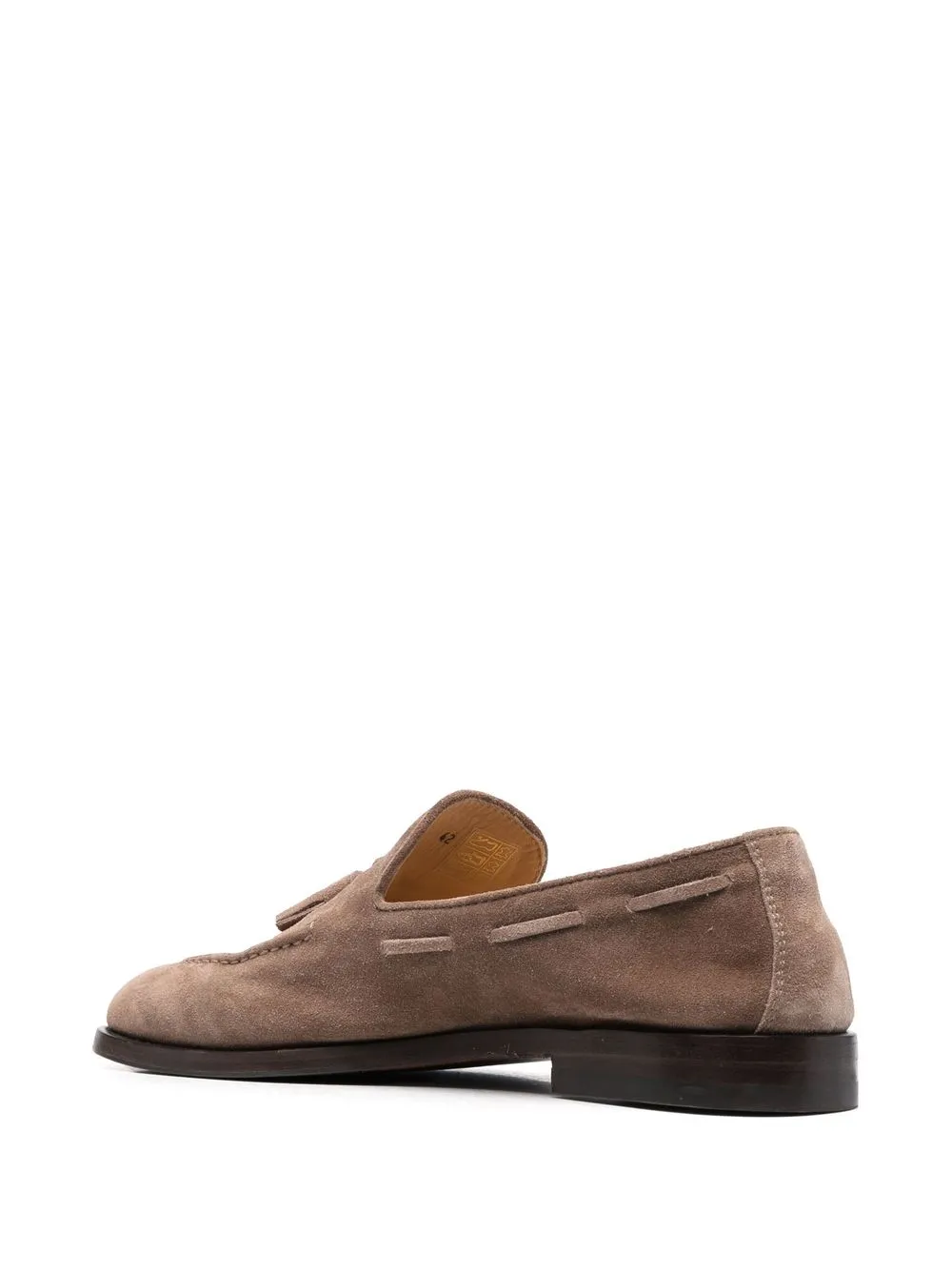 Коричневый, замша из телячьей кожи, декоративные кисточки, миндалевидный носок и плоская резиновая подошва.