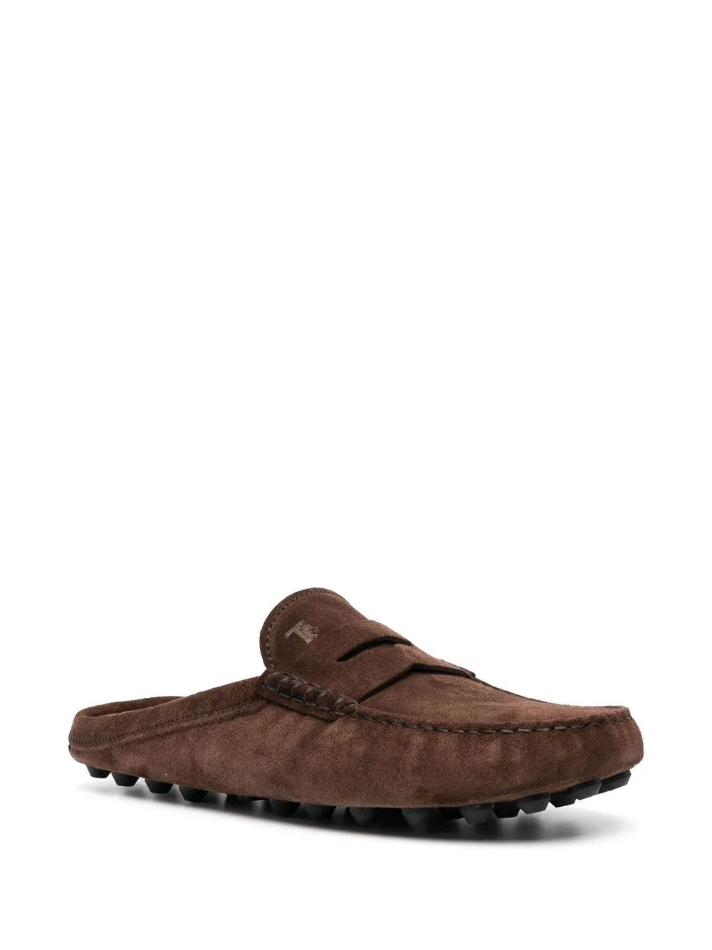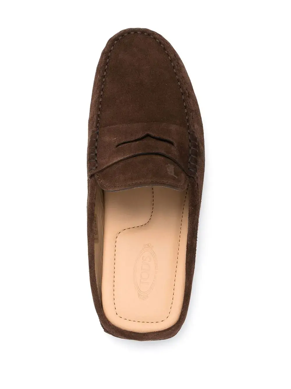 Коричневый, замша из телячьей кожи, прорези на язычке, тисненый логотип спереди, декоративная строчка, миндалевидный носок, кожаная стелька с логотипом, без задника, модель без застежки и подошва Gommino.