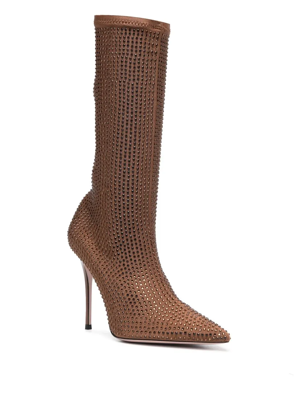 Шоколадный, телячья кожа, декор из кристаллов, каблук на высокой шпильке, заостренный носок и эластичный материал.