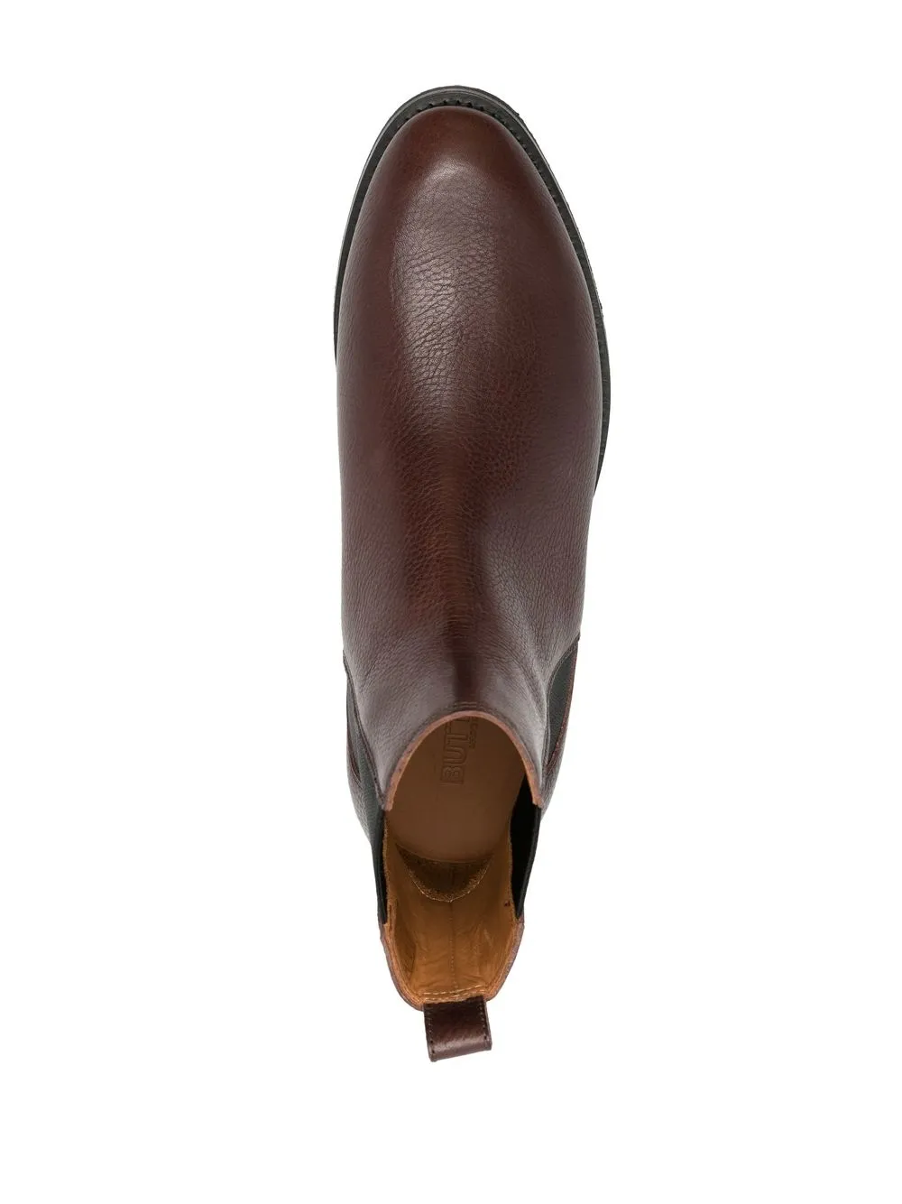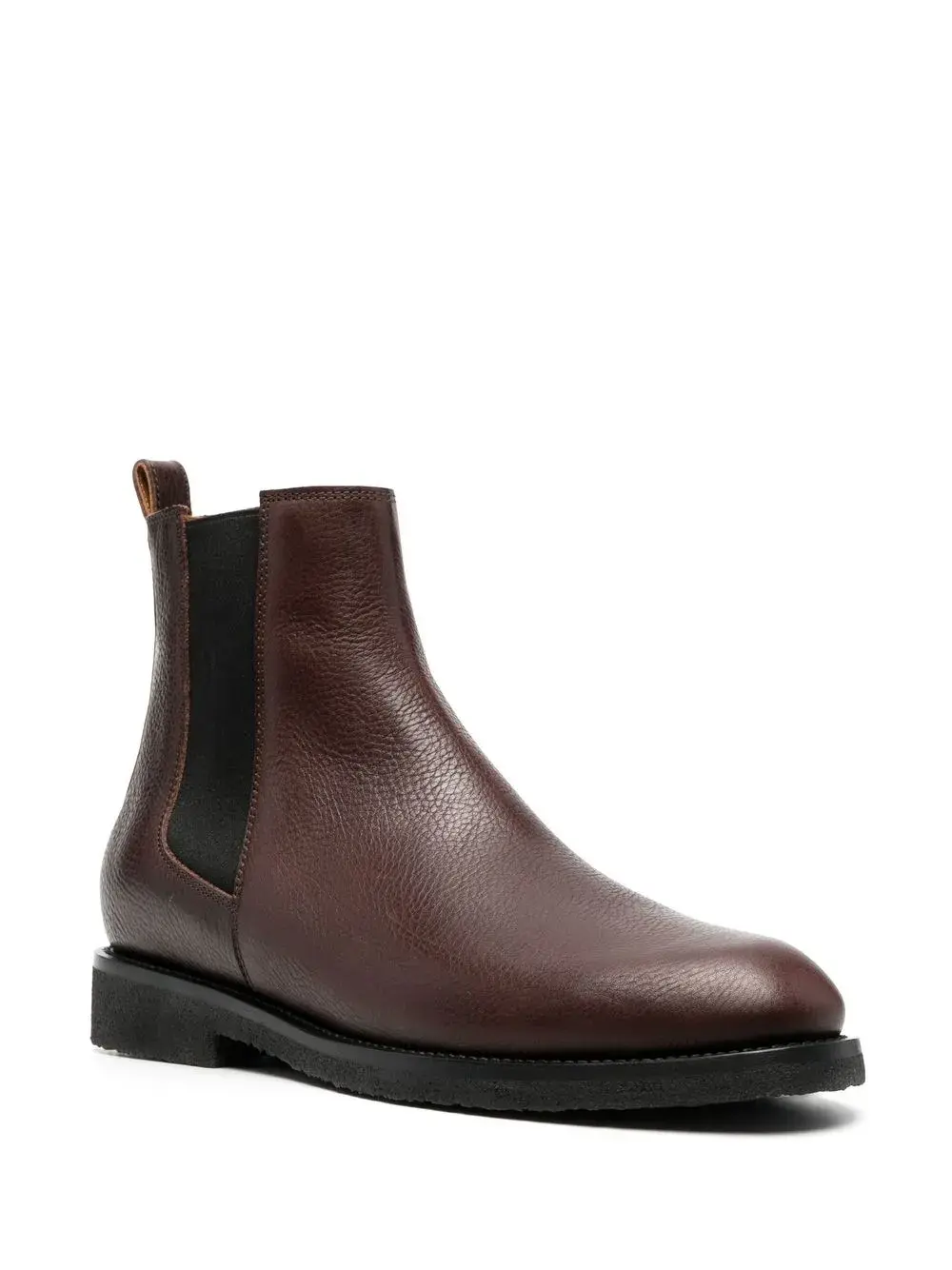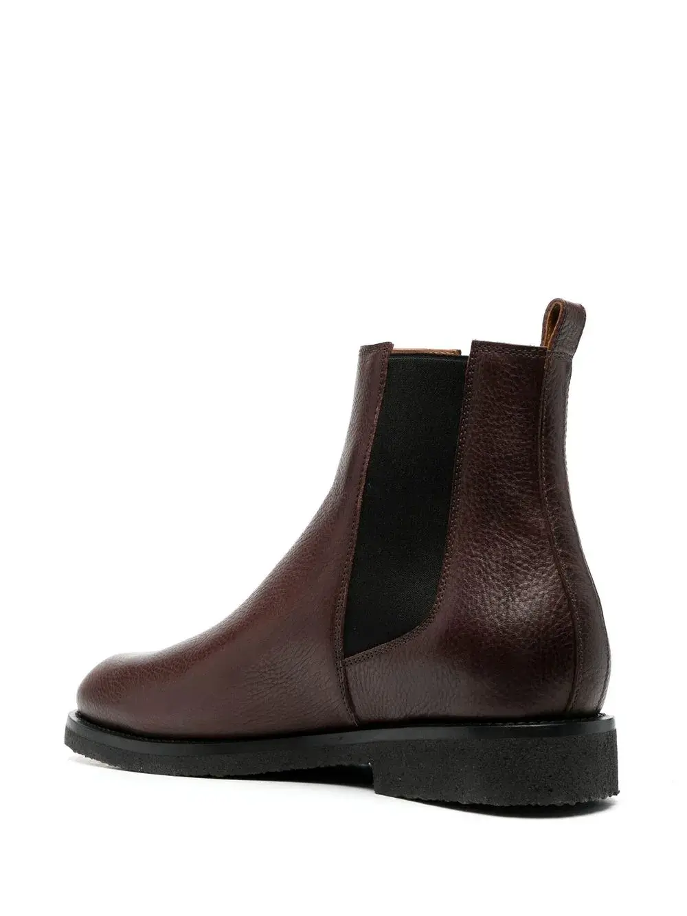 Шоколадный, телячья кожа, эластичные боковые вставки, петля для подтягивания сзади и наборная подошва.