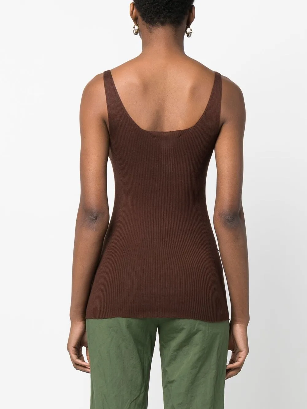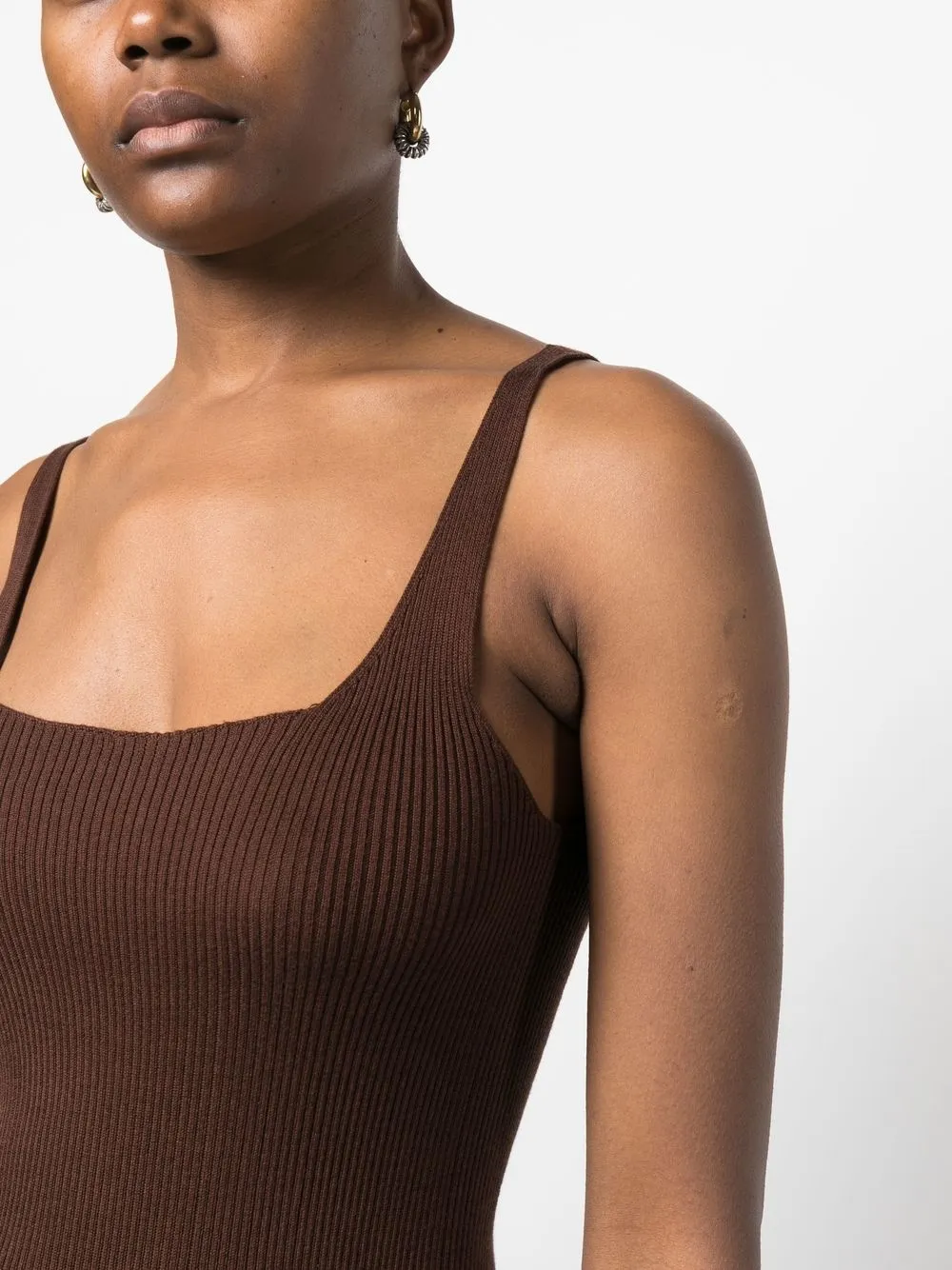 Шоколадный, смесь шелка и хлопка, трикотаж в рубчик, квадратный вырез и без рукавов.