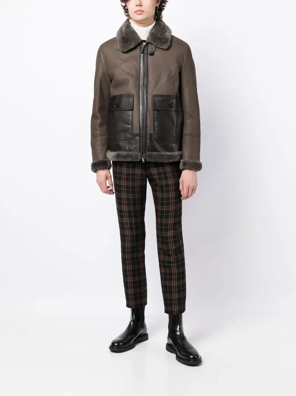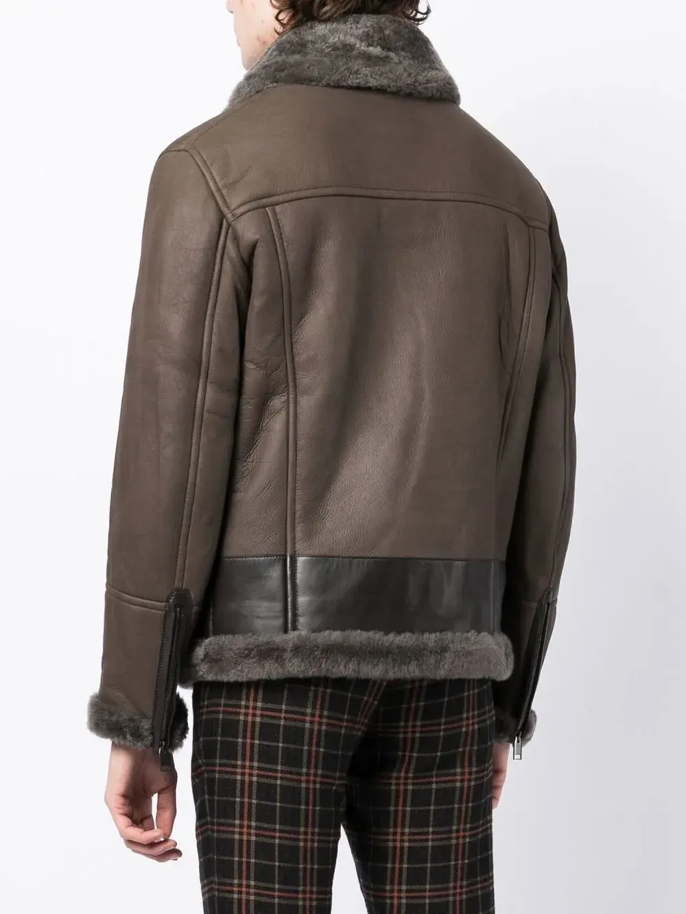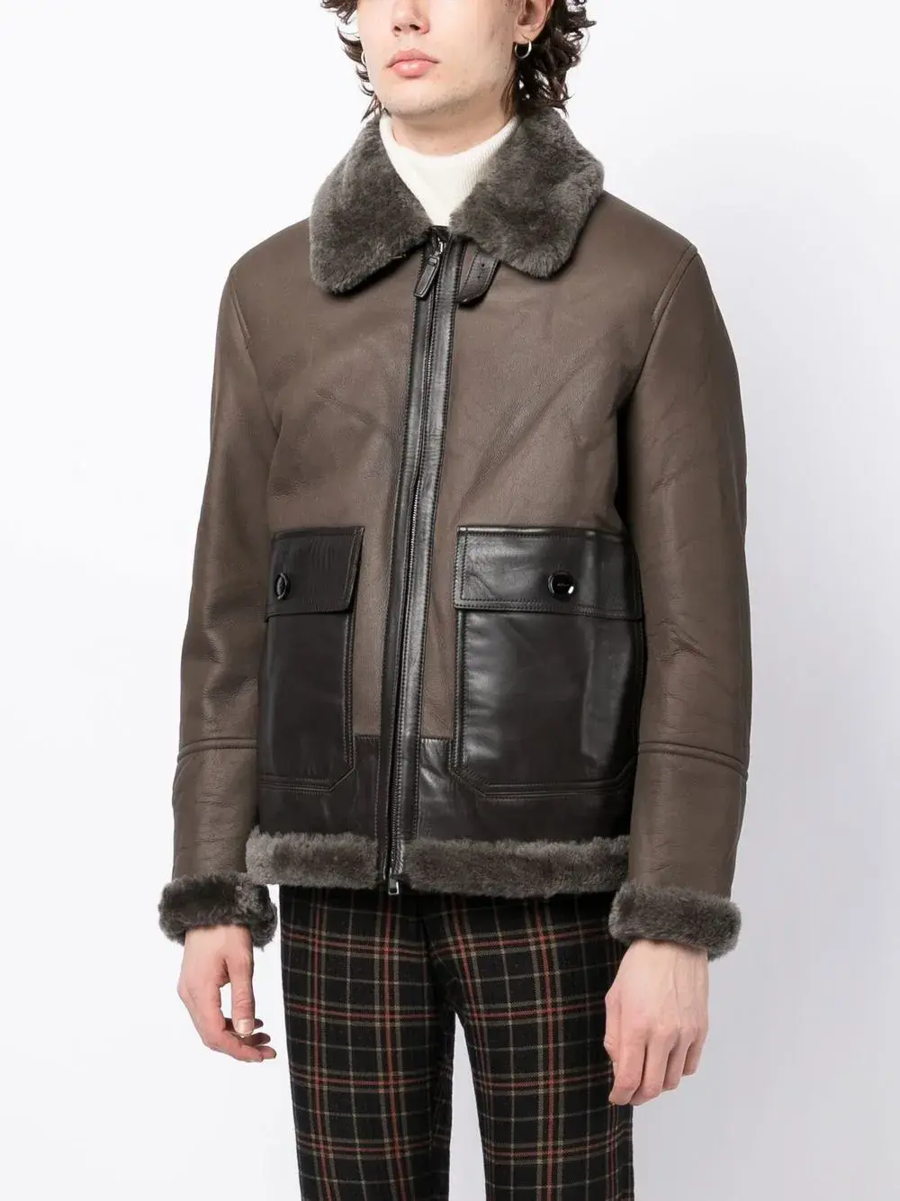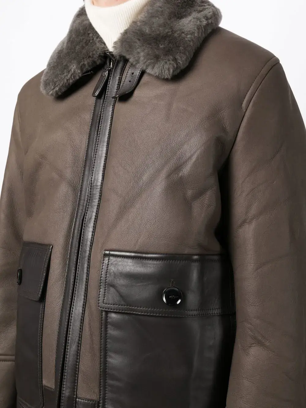 Серо-коричневый, шоколадный, овечья кожа, переработанный смесовый купро, однотонная расцветка, воротник из овечьей шерсти, высокий воротник, застежка на пряжке и ремешке, застежка на молнии спереди, два кармана с клапанами по бокам и подкладка из овечьей шерсти.