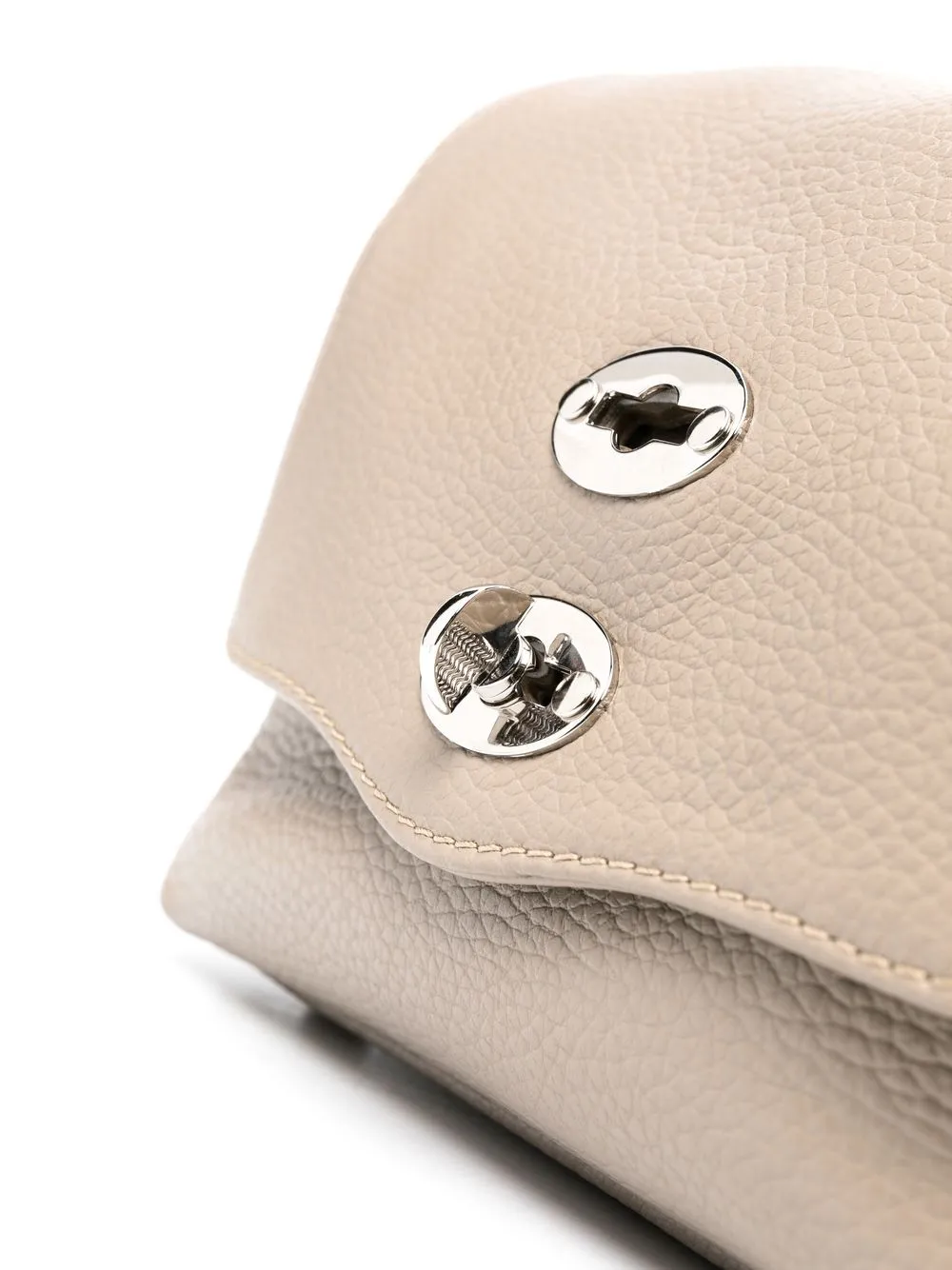 Серо-бежевый, телячья кожа, зернистая текстура, серебристая фурнитура, серебристые заклепки, ручка с плоским верхом, съемный ремень на плечо, откидной клапан, основное отделение и внутренний прорезной карман.