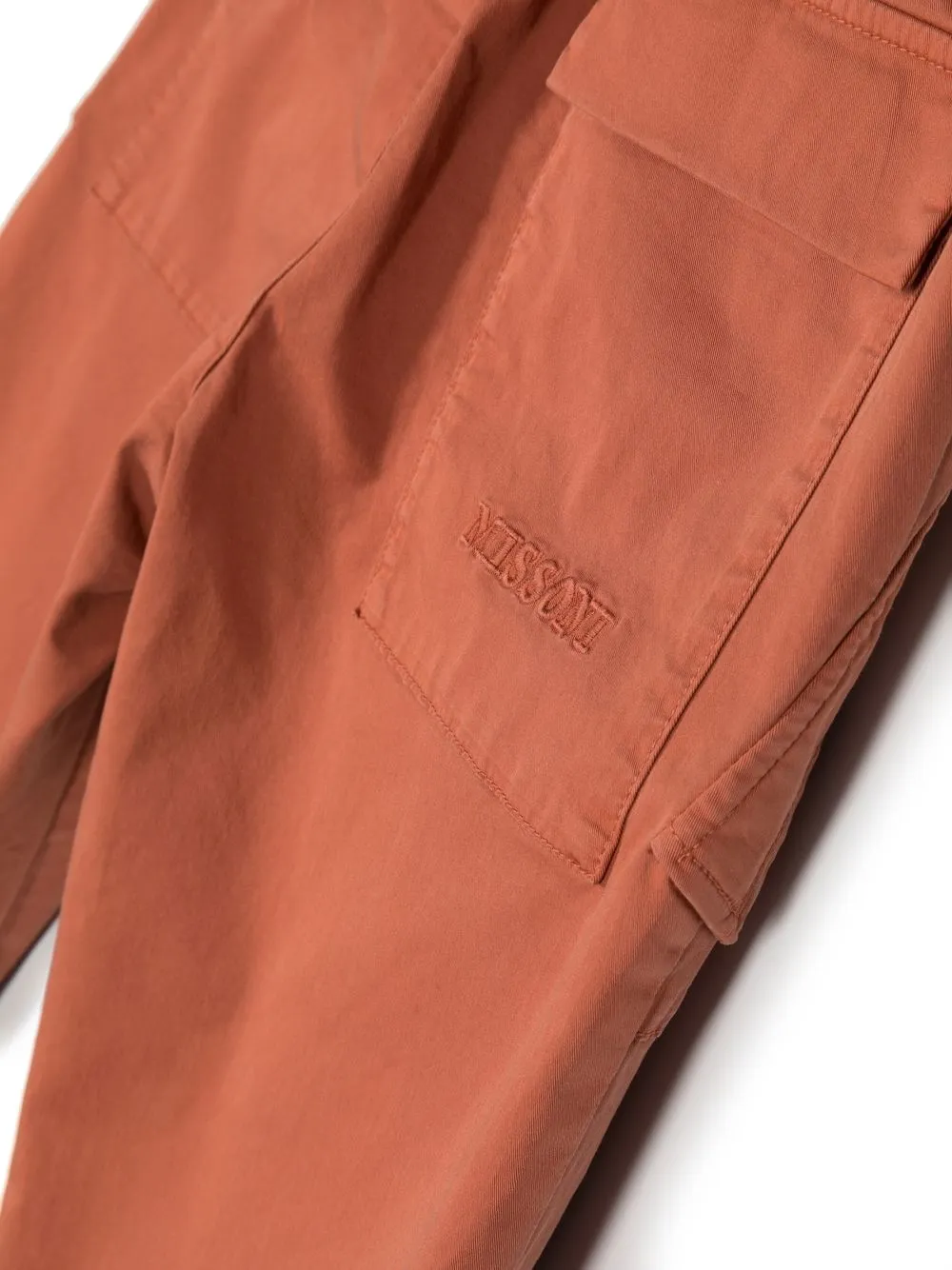 Коричнево-терракотовый, эластичный хлопок, вышитый логотип сзади, кулиска на талии, накладные карманы сбоку и два кармана с клапанами сзади.