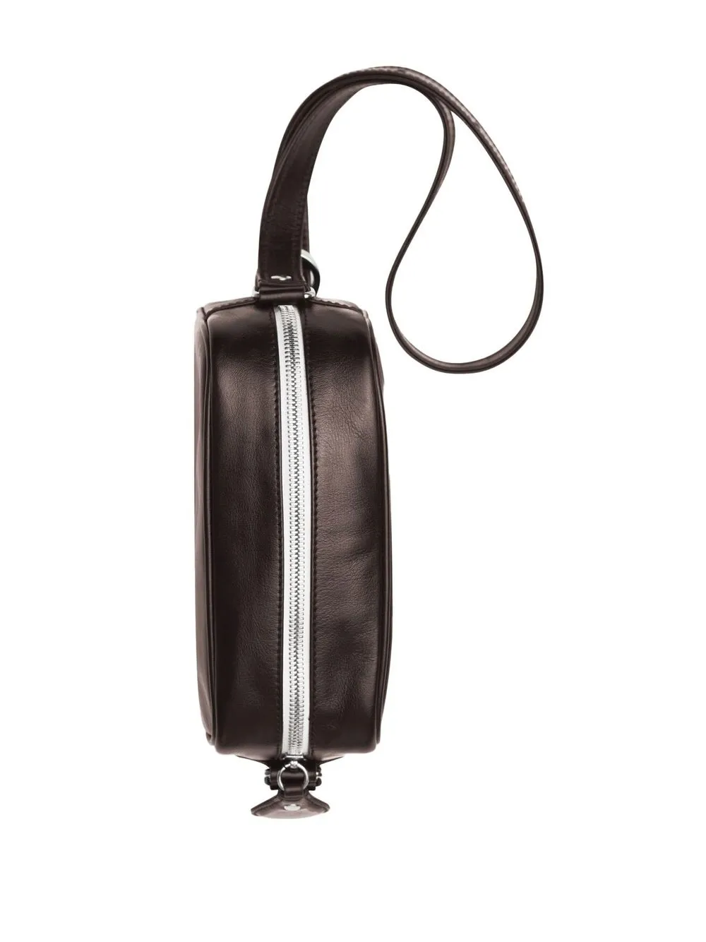 Коричневый, белый, кожа, гладкая текстура кожи, нашивка с логотипом спереди, серебристая фурнитура, застежка на молнии сверху и регулируемый ремень на плечо.