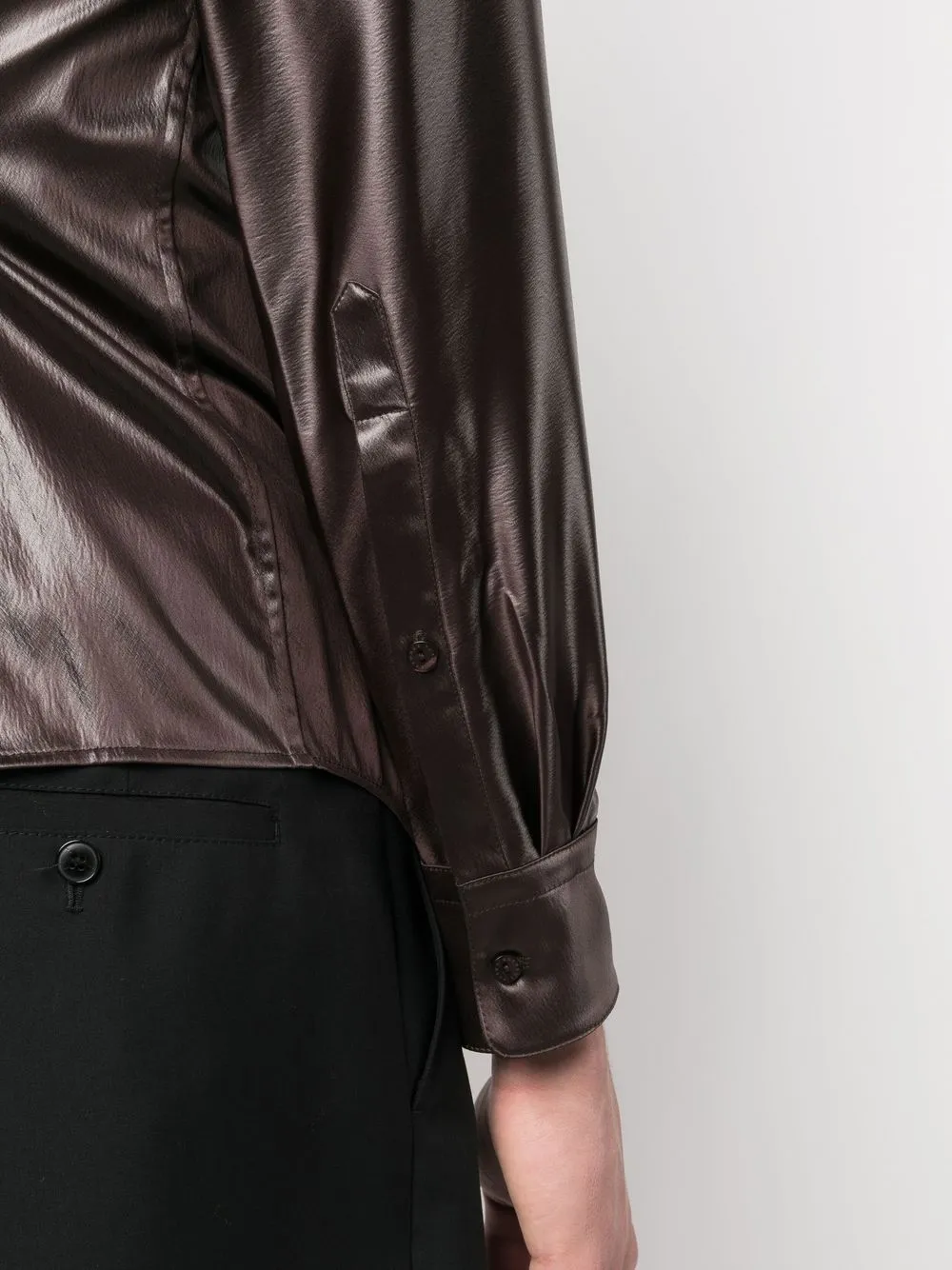 Шоколадный, покрытие с эффектом металлик, зернистая текстура, прямой воротник, застежка на пуговицах спереди, длинные рукава, манжеты на пуговицах и закругленный подол.
