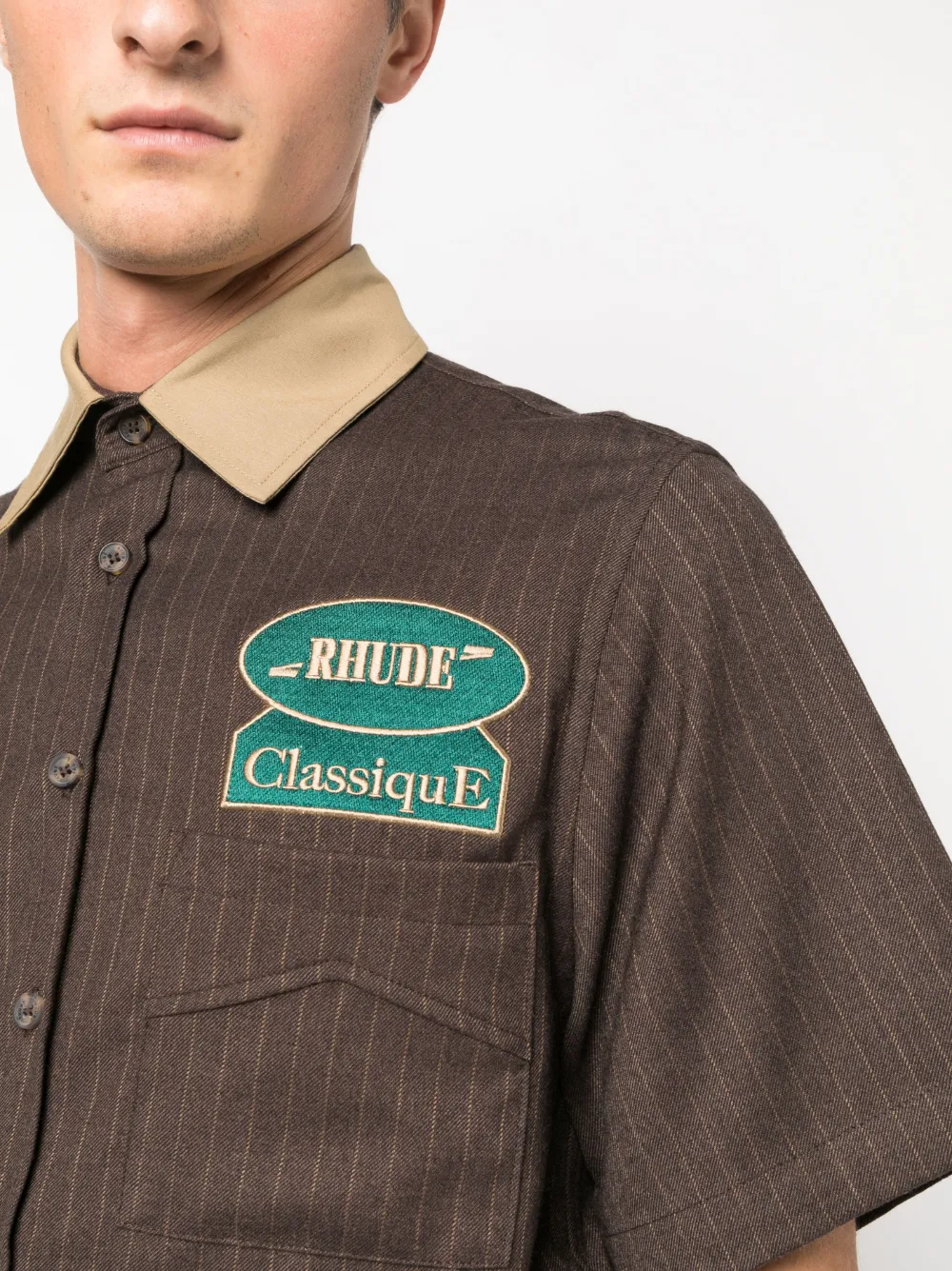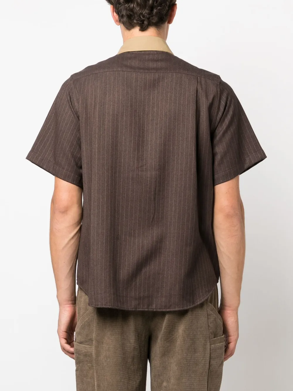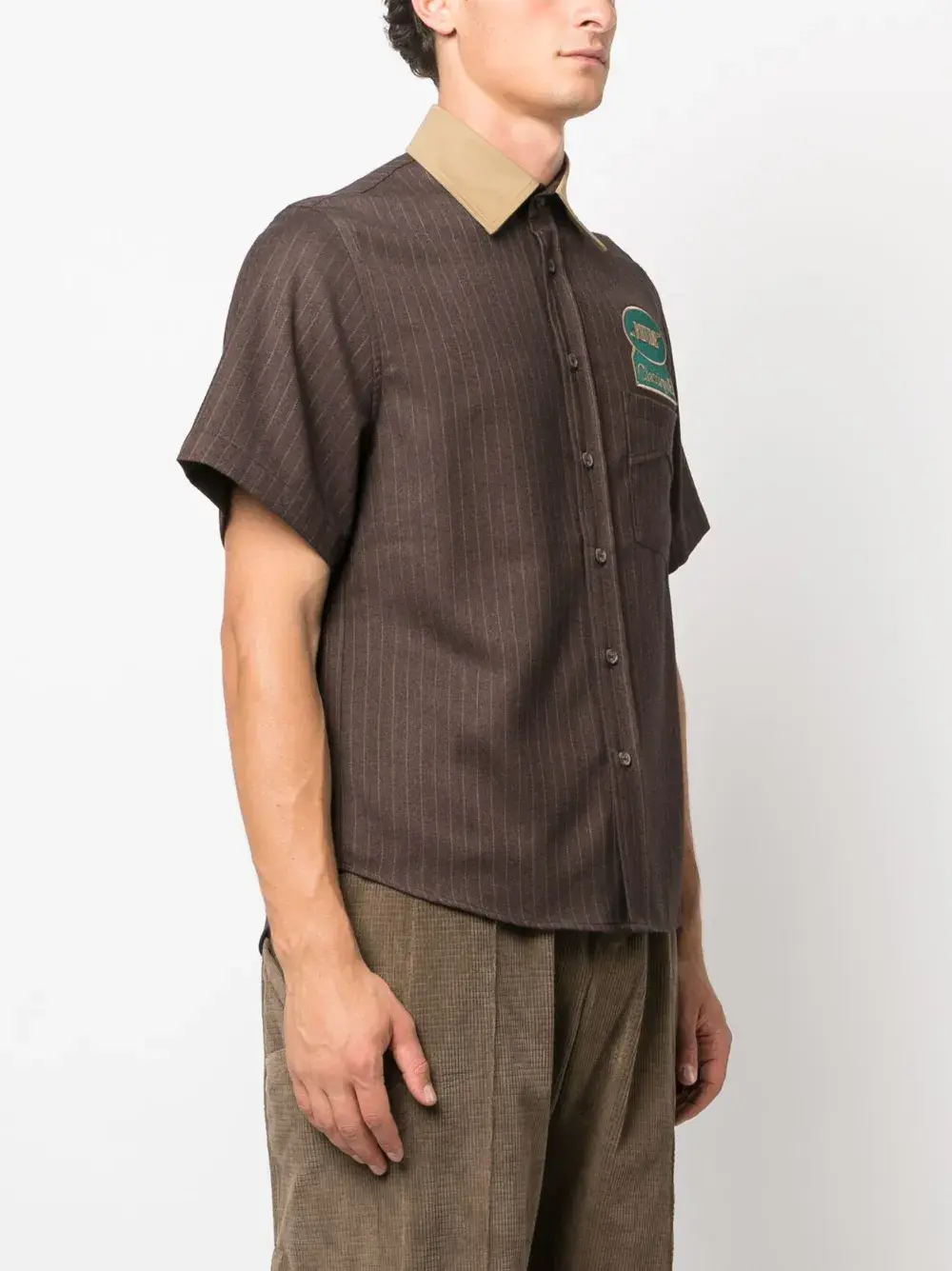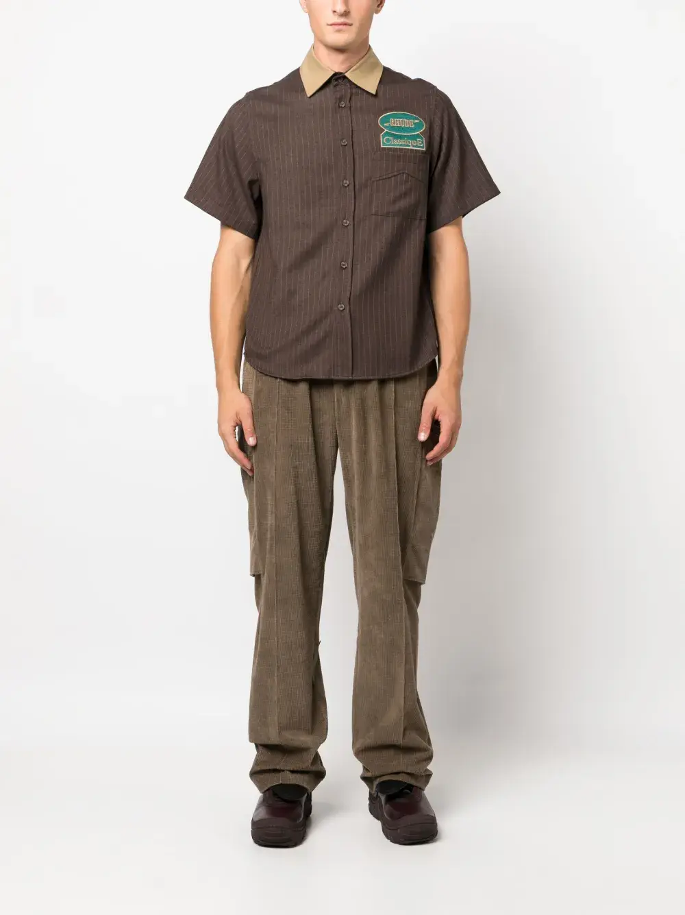 Коричневый, ткань с твиловым переплетением, нашивка с логотипом на груди, узор в полоску, короткие рукава, отложной воротник, застежка на пуговицах спереди, подкладка из хлопка и закругленный подол.