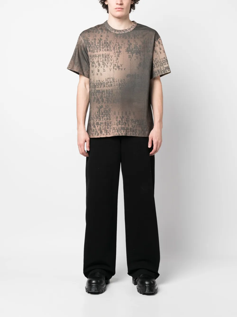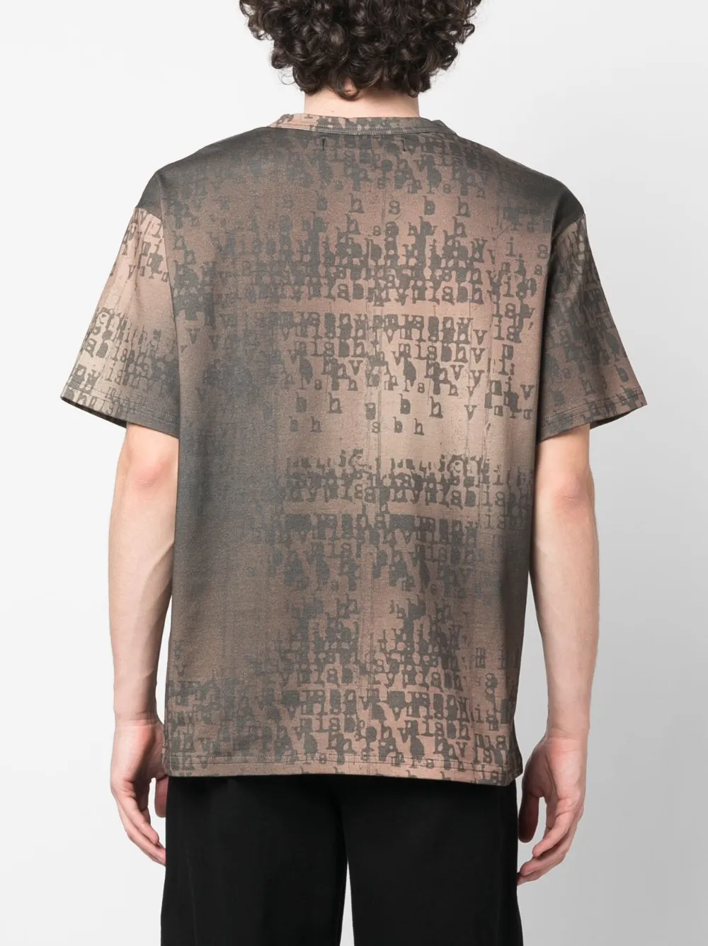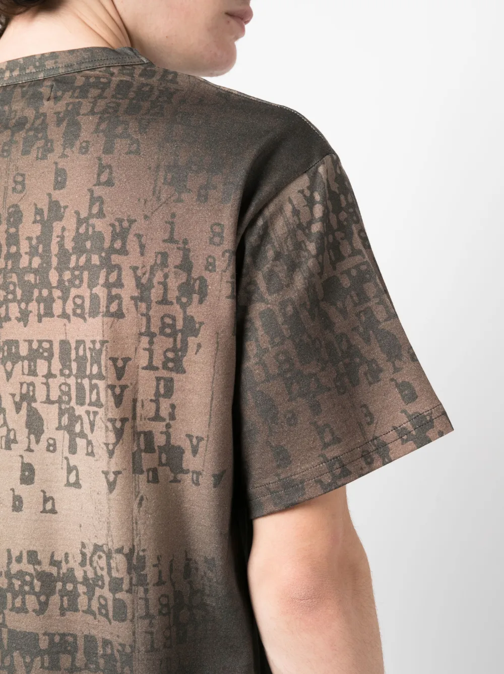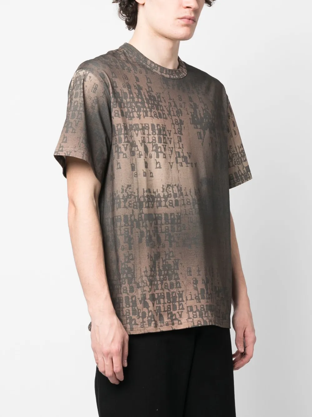 Серо-коричневый, хлопок, эффект обесцвечивания, сплошной принт с логотипом, круглый вырез, короткие рукава и прямой подол.