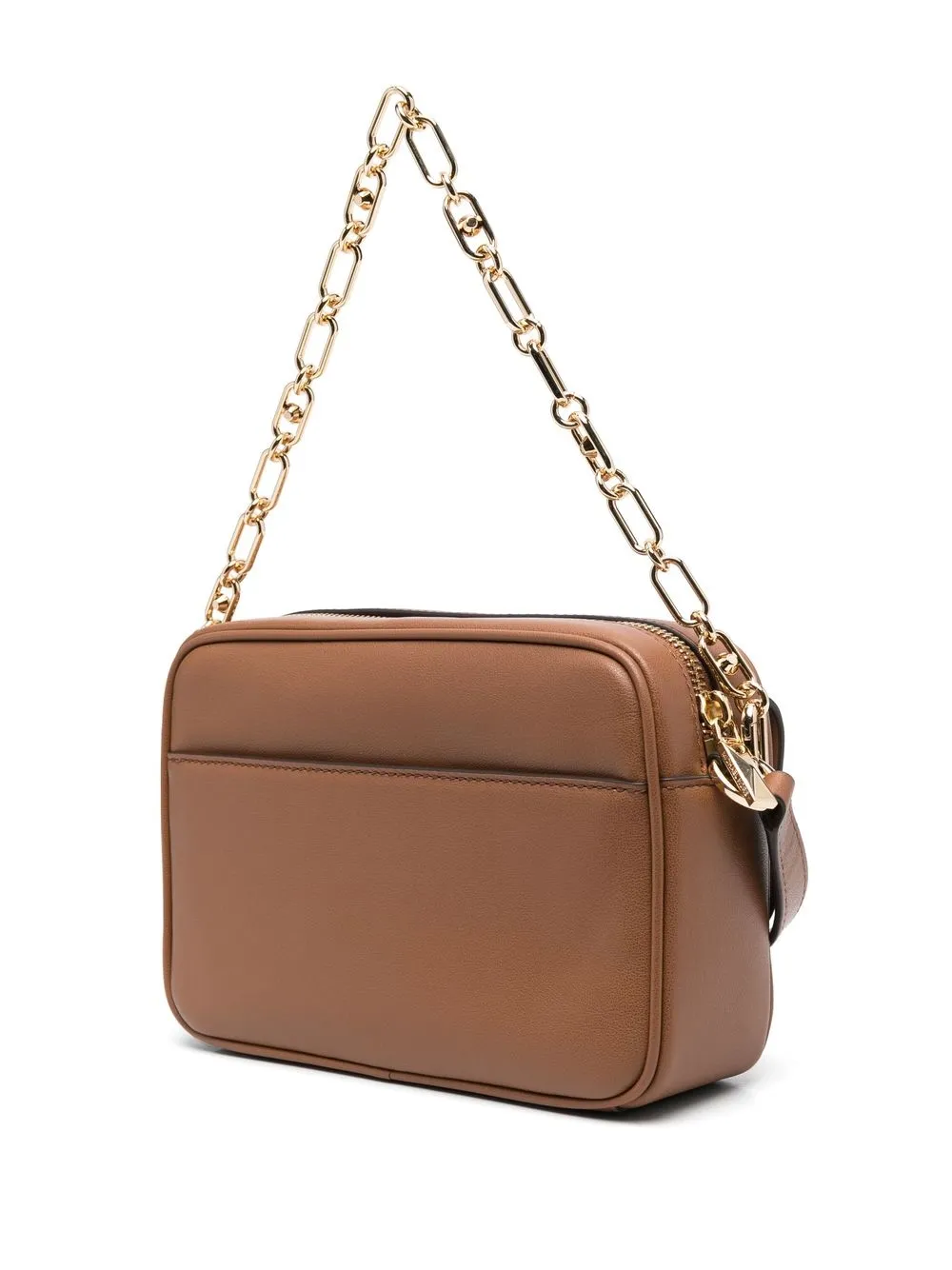 Светло-коричневый, телячья кожа, золотистая фурнитура, золотистый металлический логотип, золотистые заклепки, застежка на молнии сверху, ремень на плечо, цепочный ремень и внутренний карман на молнии.