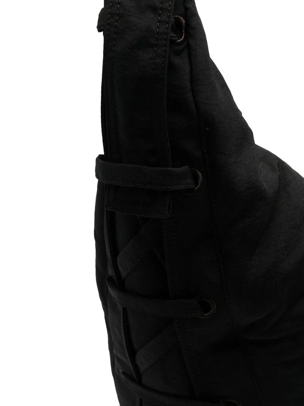 Шоколадный, водоотталкивающий материал, люверсы, регулируемый ремень на плечо, застежка на молнии сверху, завязки по бокам, основное отделение и внутренний карман на молнии.