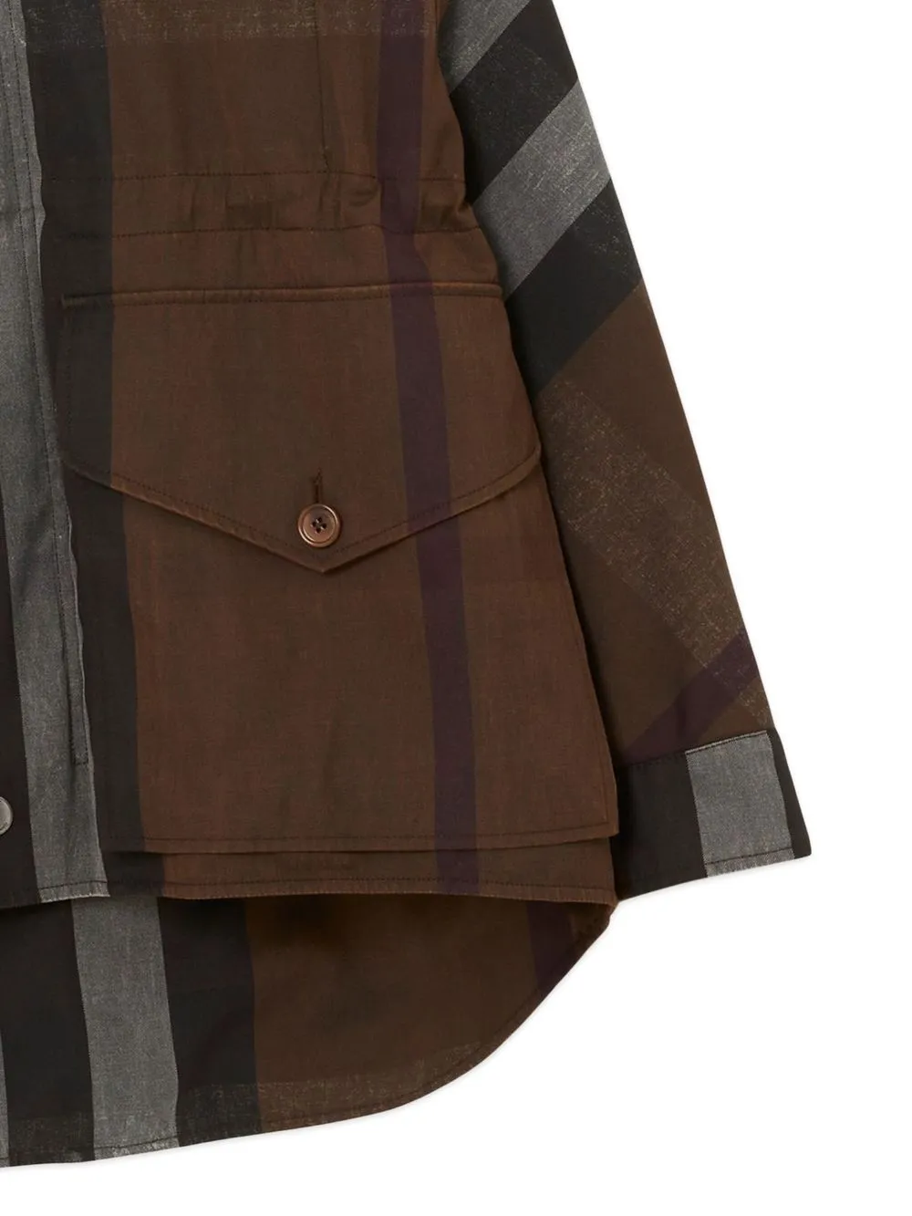 Шоколадный, хлопок, клетчатый принт Vintage Check, закругленный подол сзади, кулиска на талии, классический воротник, застежка на кнопки и молнию спереди, длинные рукава, манжеты с застежкой на кнопки, нагрудный карман с клапаном и два передних кармана с клапанами.