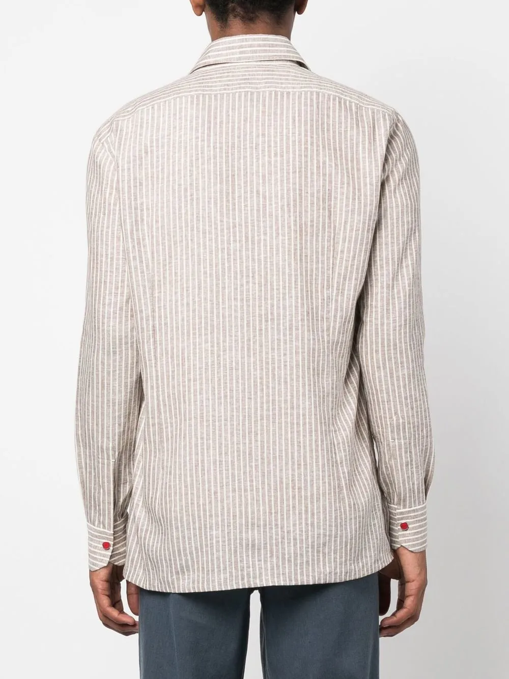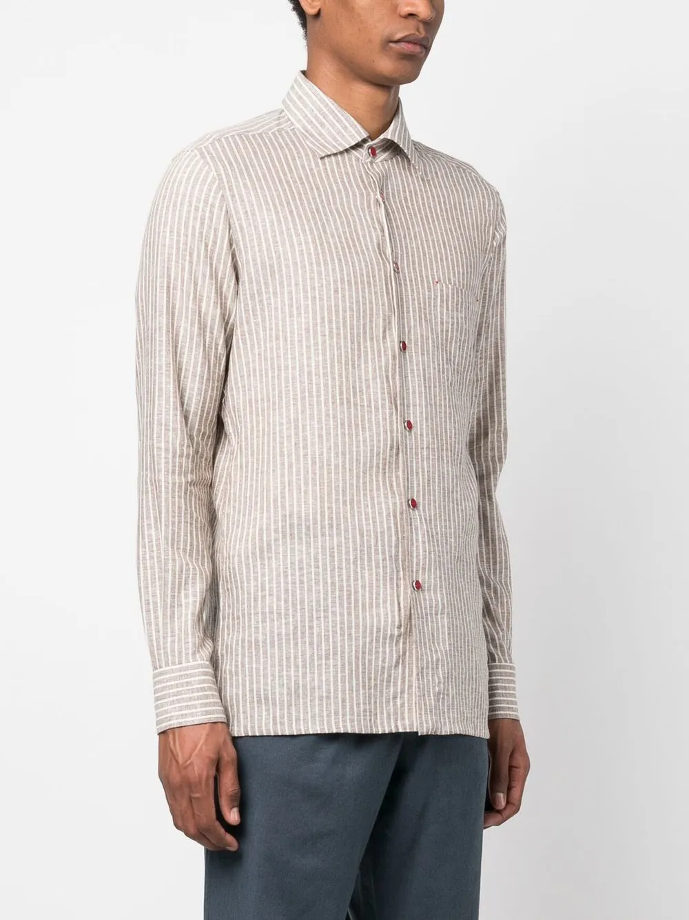 Подробнее о товаре: Коричневый, бежевый, смесовый лен, узор в вертикальную полоску, классический воротник, застежка на пуговицах спереди, длинные рукава, манжеты на пуговицах и прямой подол. Этот товар как минимум на 50% состоит из материалов, которые признаны более безопасными для окружающей среды, и/или произведены с использованием методов, которые помогают сократить потребление воды и химических веществ. Узнать больше о том, какие товары получают отметку «Ответственный выбор», можно из материала «Как мы оцениваем экологичность и этичность».
