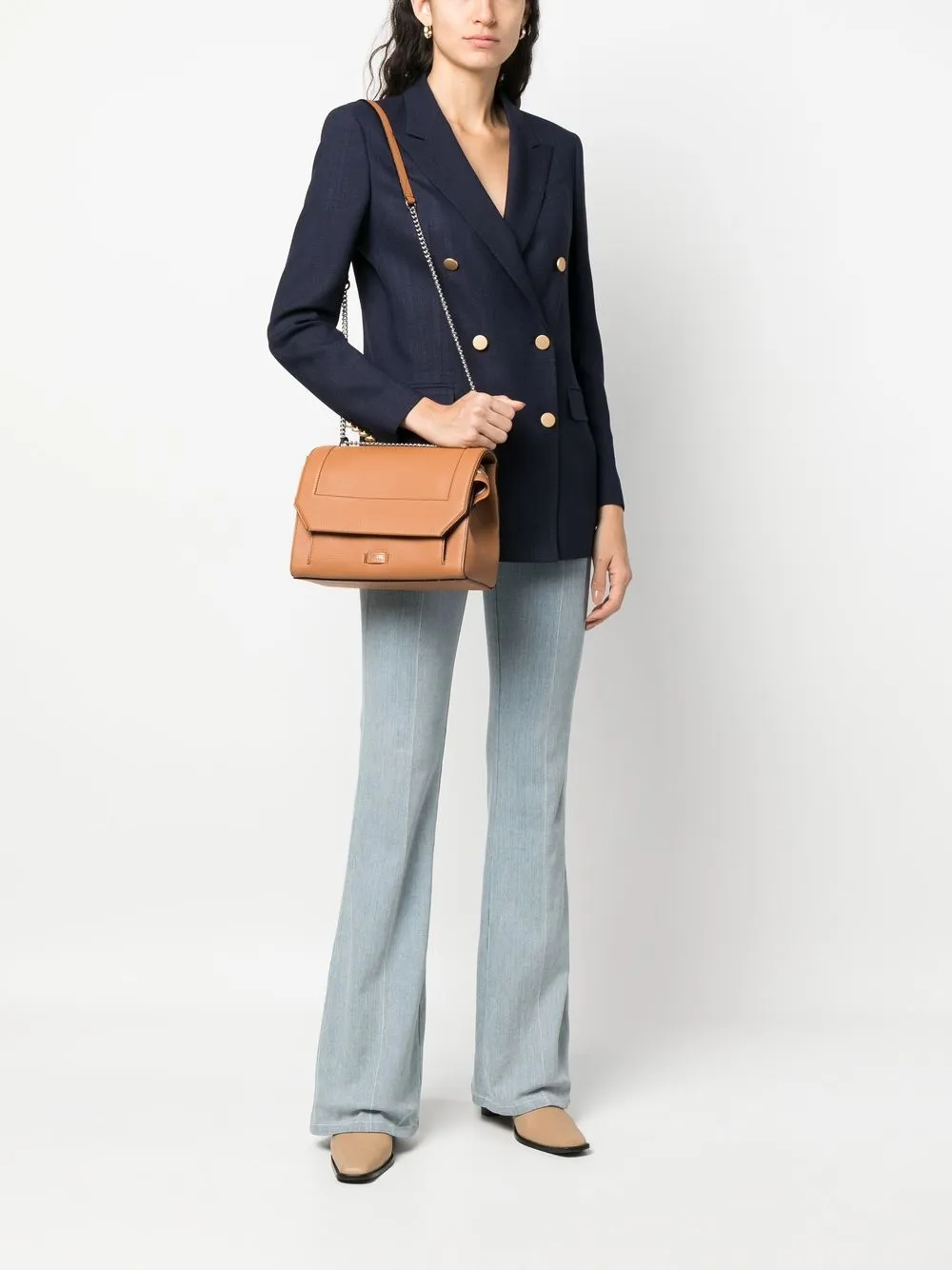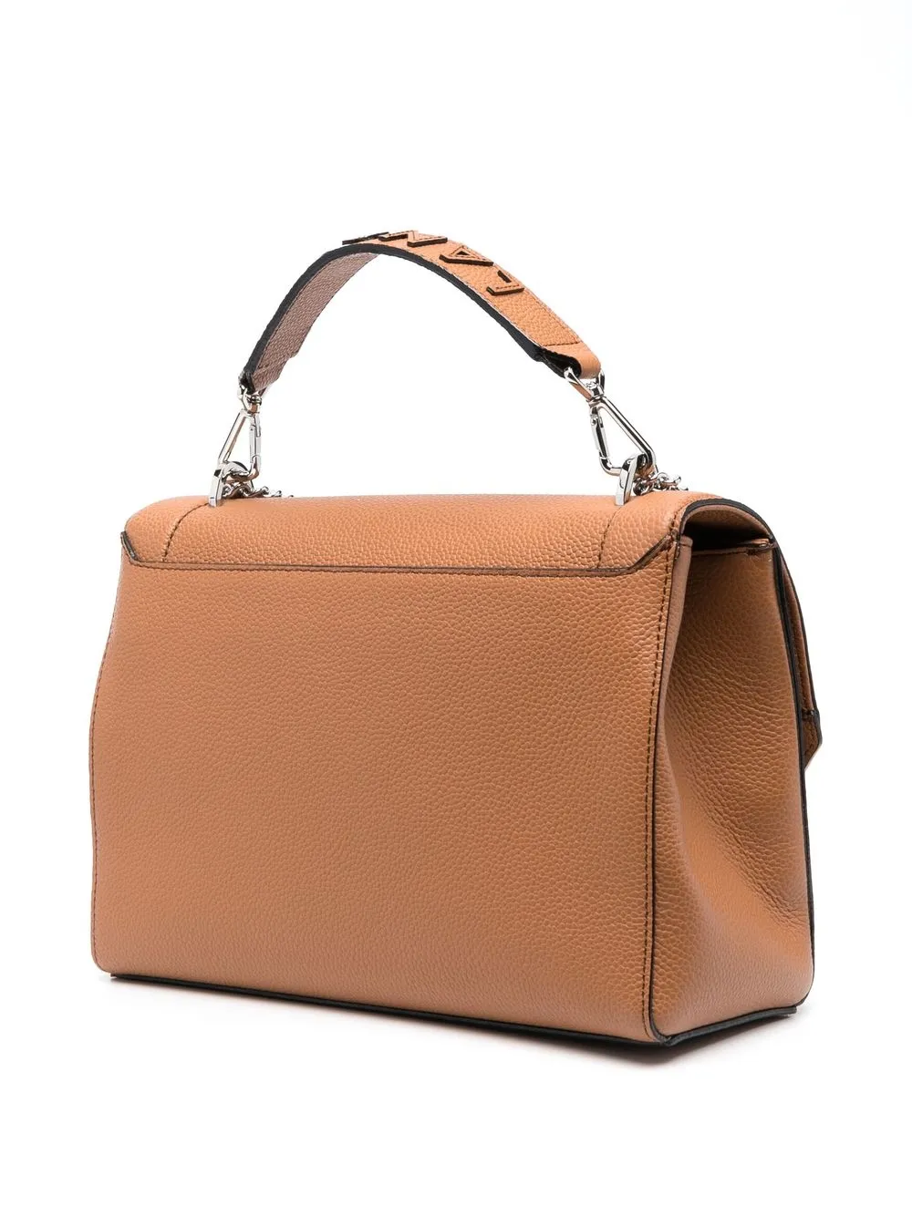 Коричневый, телячья кожа, откидной клапан, нашивка с логотипом спереди, верхняя ручка из кожи и металла, съемный ремень из кожи и металла, внутренние карманы на молнии и основное отделение.