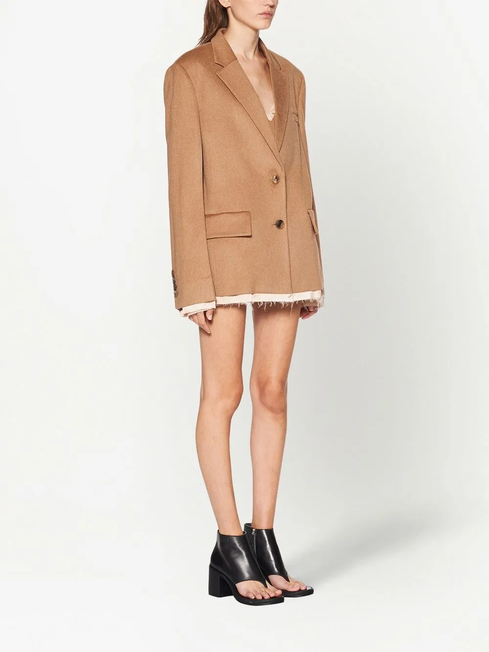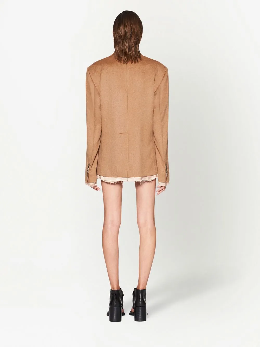 Бежево-коричневый, шерсть верблюда, многослойный дизайн, необработанные края, лиф с подкладкой, вышитый логотип на груди, зазубренные лацканы, застежка на пуговицах спереди, два передних кармана с клапанами, рукава с манжетами на пуговицах и шлица по центру сзади.