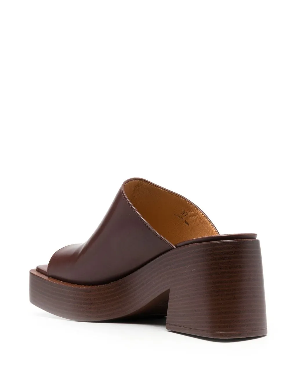 Коричневый, кожа, тисненый логотип сбоку, открытый носок, логотип на стельке, подошва на платформе, резиновая подошва и высокий блочный каблук.
