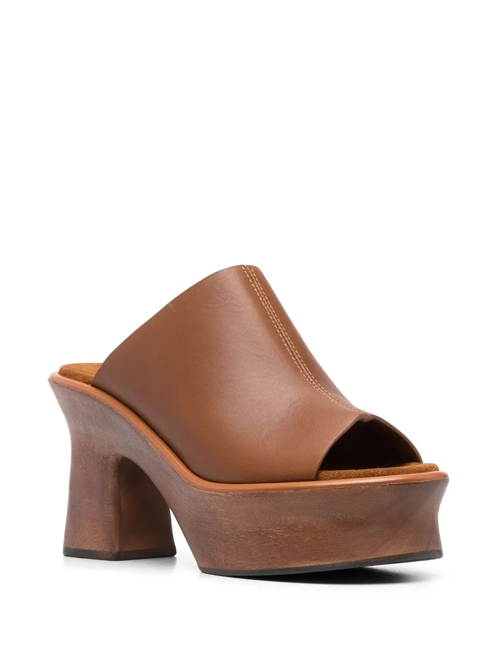 Бежево-коричневый, телячья кожа, модель без застежки, открытая спина, открытый носок, блочный каблук, кожаная стелька с логотипом и подошва на деревянной платформе.