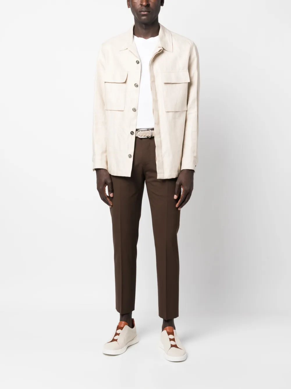 Шоколадный, необработанная шерсть, эластичная шерсть, стрелки, узкий крой, петли для ремня, потайная застежка спереди, два вшитых кармана по бокам, два прорезных кармана сзади и укороченная длина.