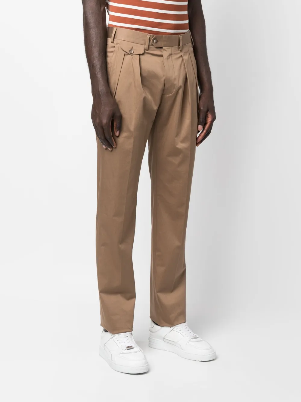 Нежно-коричневый, эластичный хлопок, складки, петли для ремня, застежка на молнии и пуговице спереди, прорезные карманы по бокам, два прорезных кармана на пуговицах сзади и прямой крой.