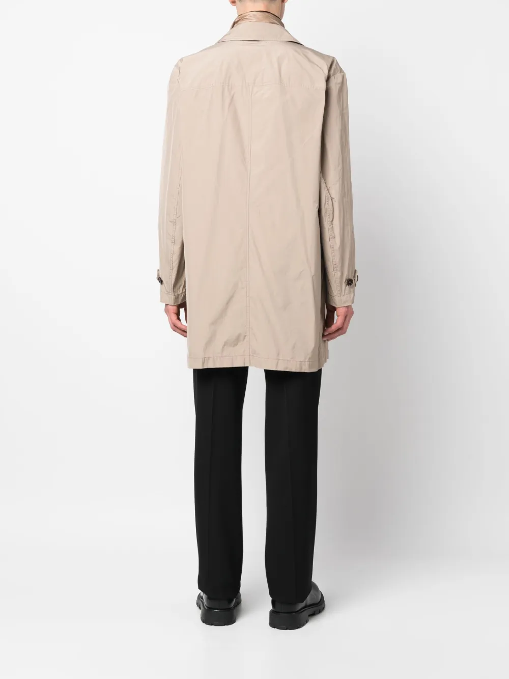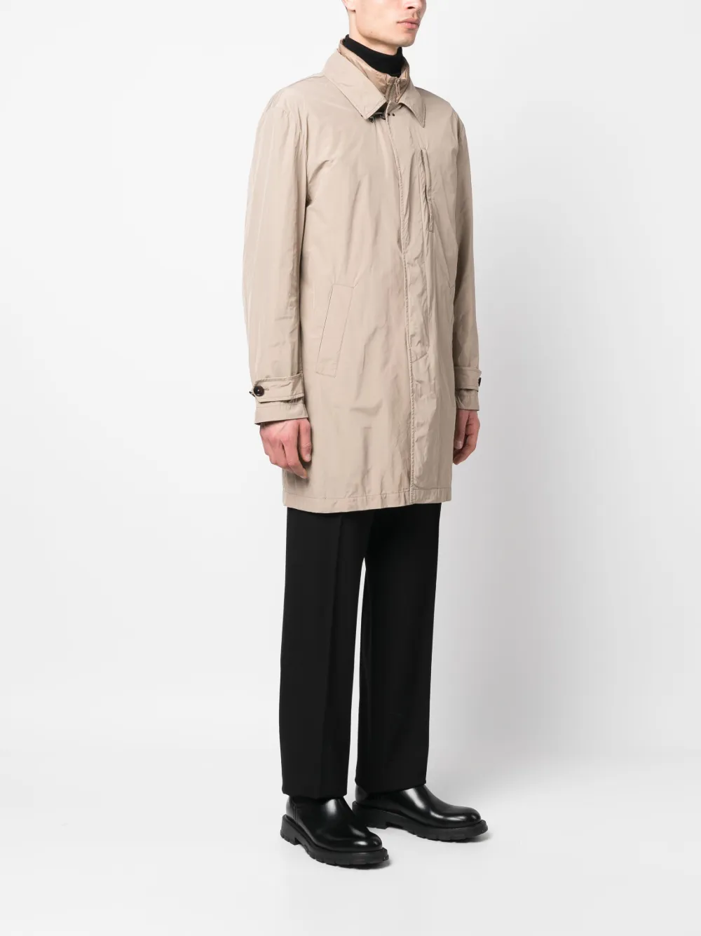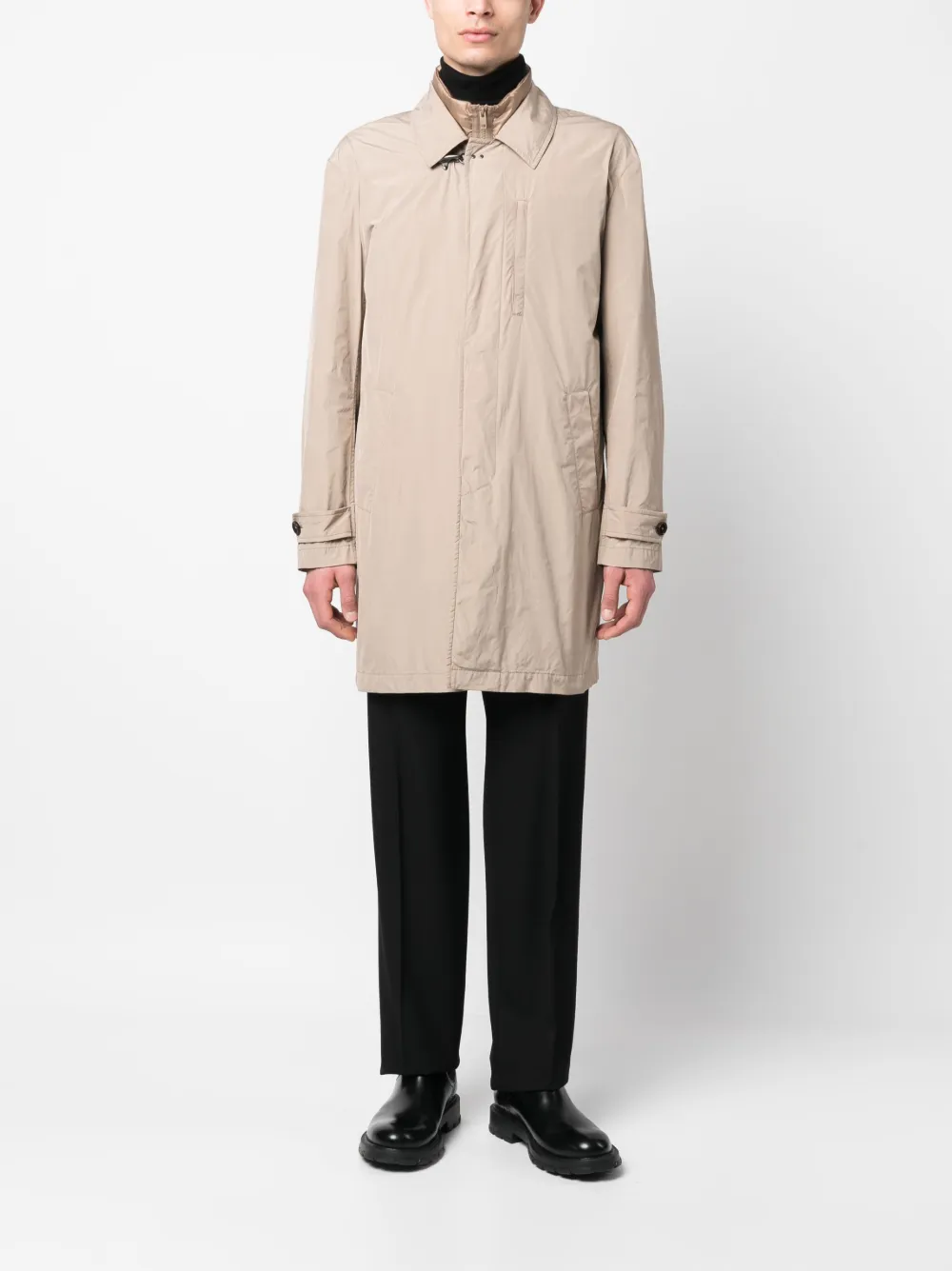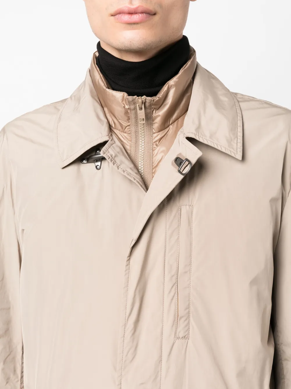 Серо-коричневый, многослойный дизайн, глянцевая фактура, воротник-стойка, без рукавов, застежка на молнии спереди, два нагрудных кармана с клапанами, два кармана на молнии по бокам, прямой подол, отложной воротник, длинные рукава, манжеты с ремешками, два нагрудных кармана на молнии, потайная молния спереди и длина до бедер.