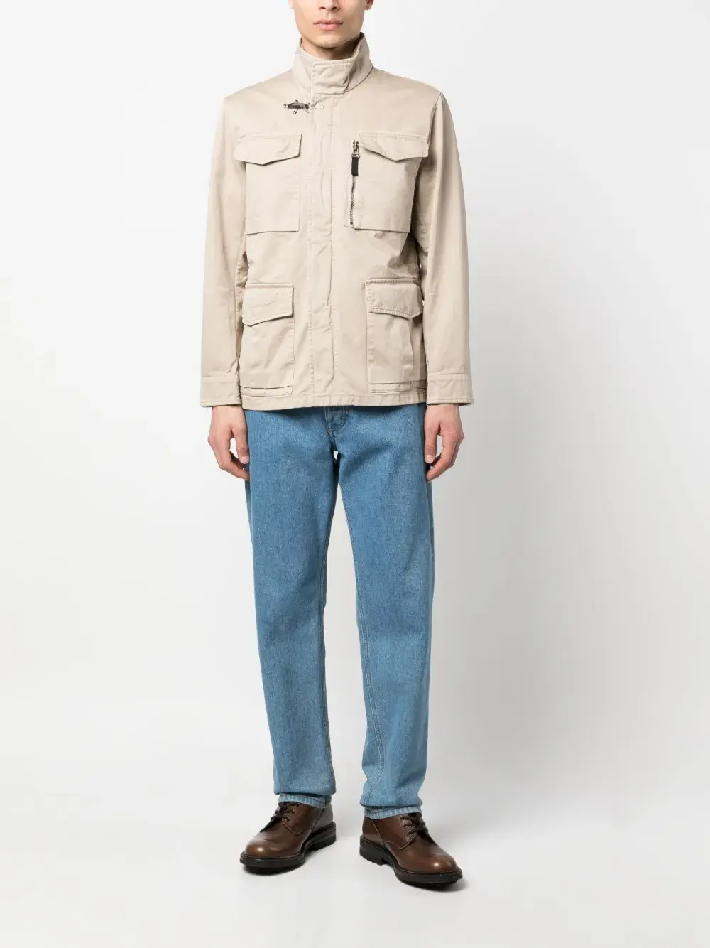 Песочно-коричневый, хлопок, швы, высокий воротник, застежка на зажиме спереди, длинные рукава, накладные карманы и два нагрудных кармана на молнии.