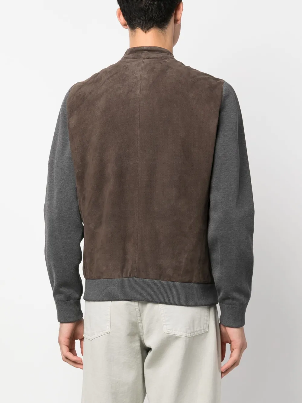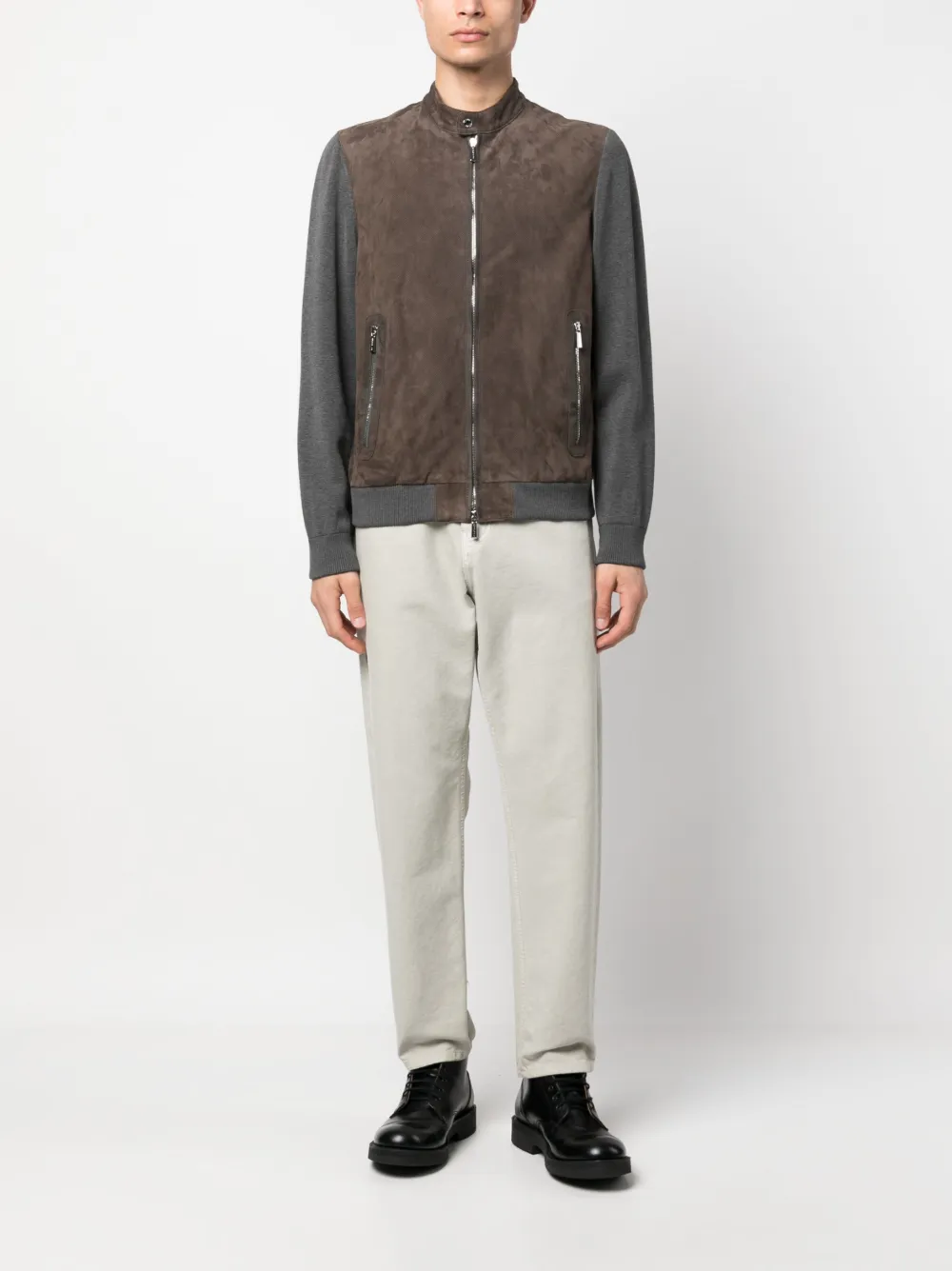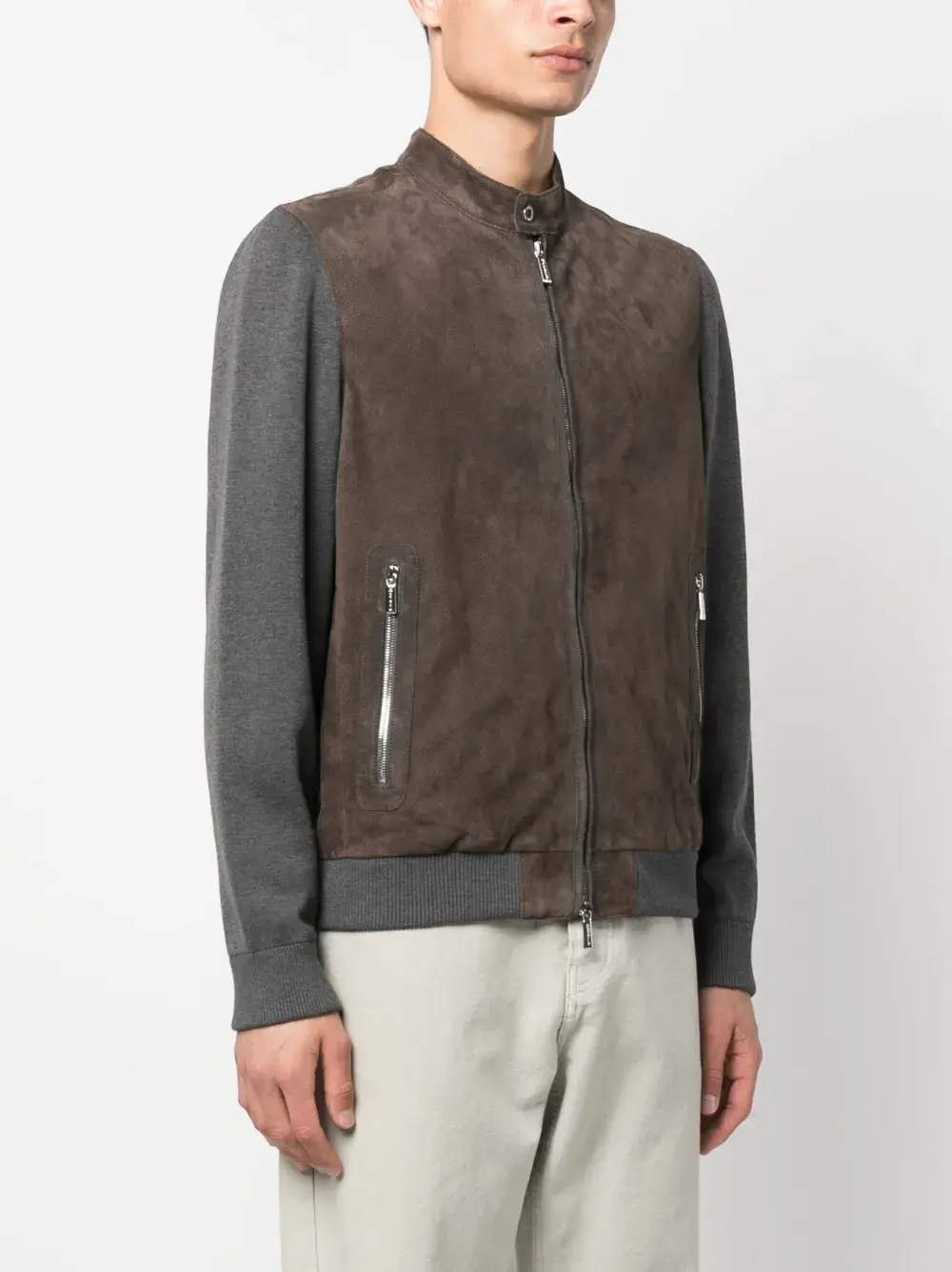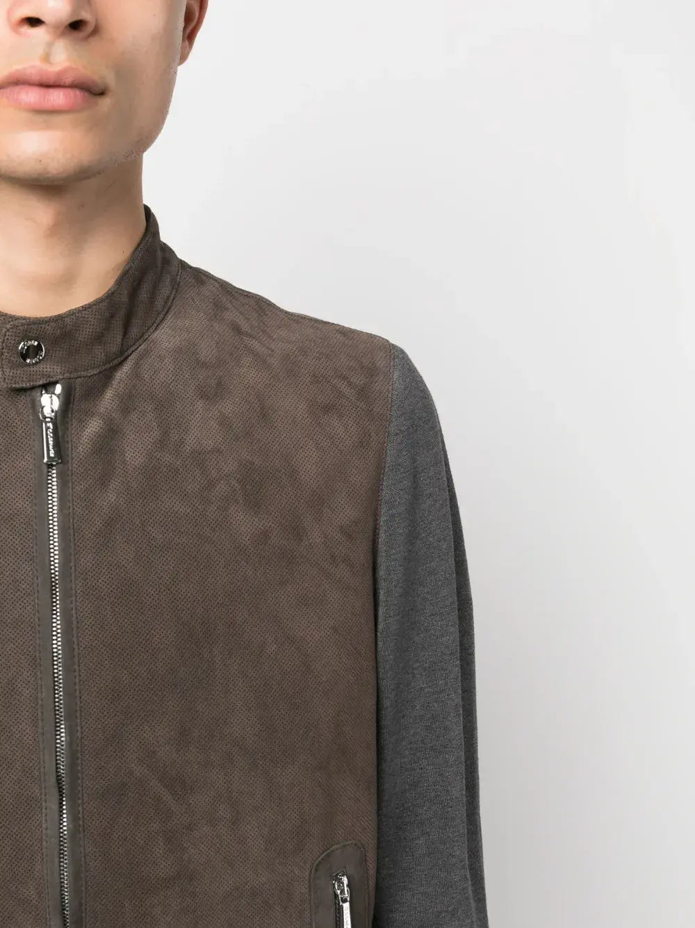 Коричневый, серый, кожа, хлопок, контрастные рукава, края в рубчик, двусторонняя молния спереди, воротник с застежкой на кнопки, два кармана на молнии по бокам, длинные рукава и прямой подол.