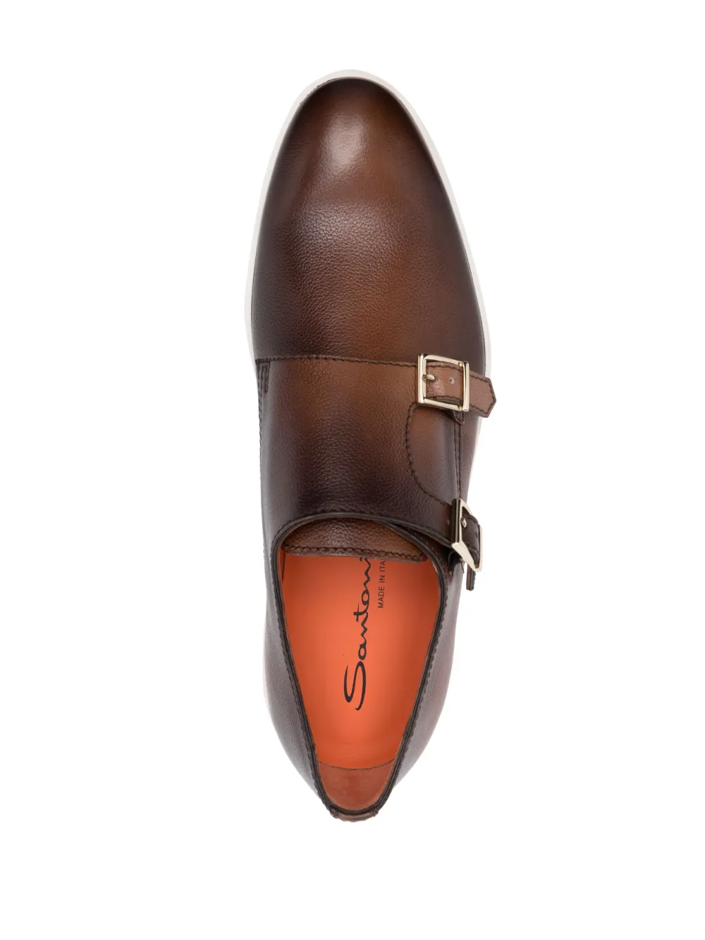 Черный, телячья кожа, миндалевидный носок, застежка с двумя пряжками, стелька с логотипом и плоская резиновая подошва.