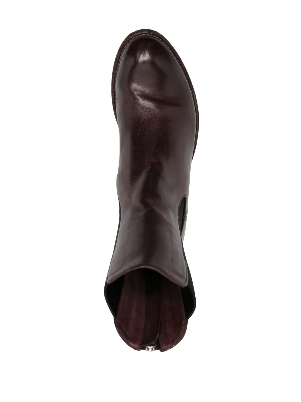 Каштановый, телячья кожа, гладкая текстура кожи, высота по щиколотку, эластичные боковые вставки, миндалевидный носок, застежка на молнии сзади и низкий блочный каблук.