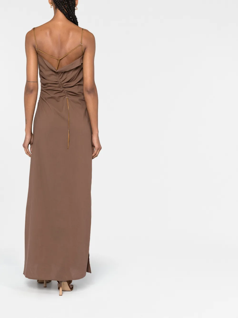 Серо-коричневый, хлопок, дизайн со сборками, драпировка, квадратный вырез, тонкие бретели, два выреза до бедер по бокам, потайная застежка на молнии сбоку и высота по щиколотку.