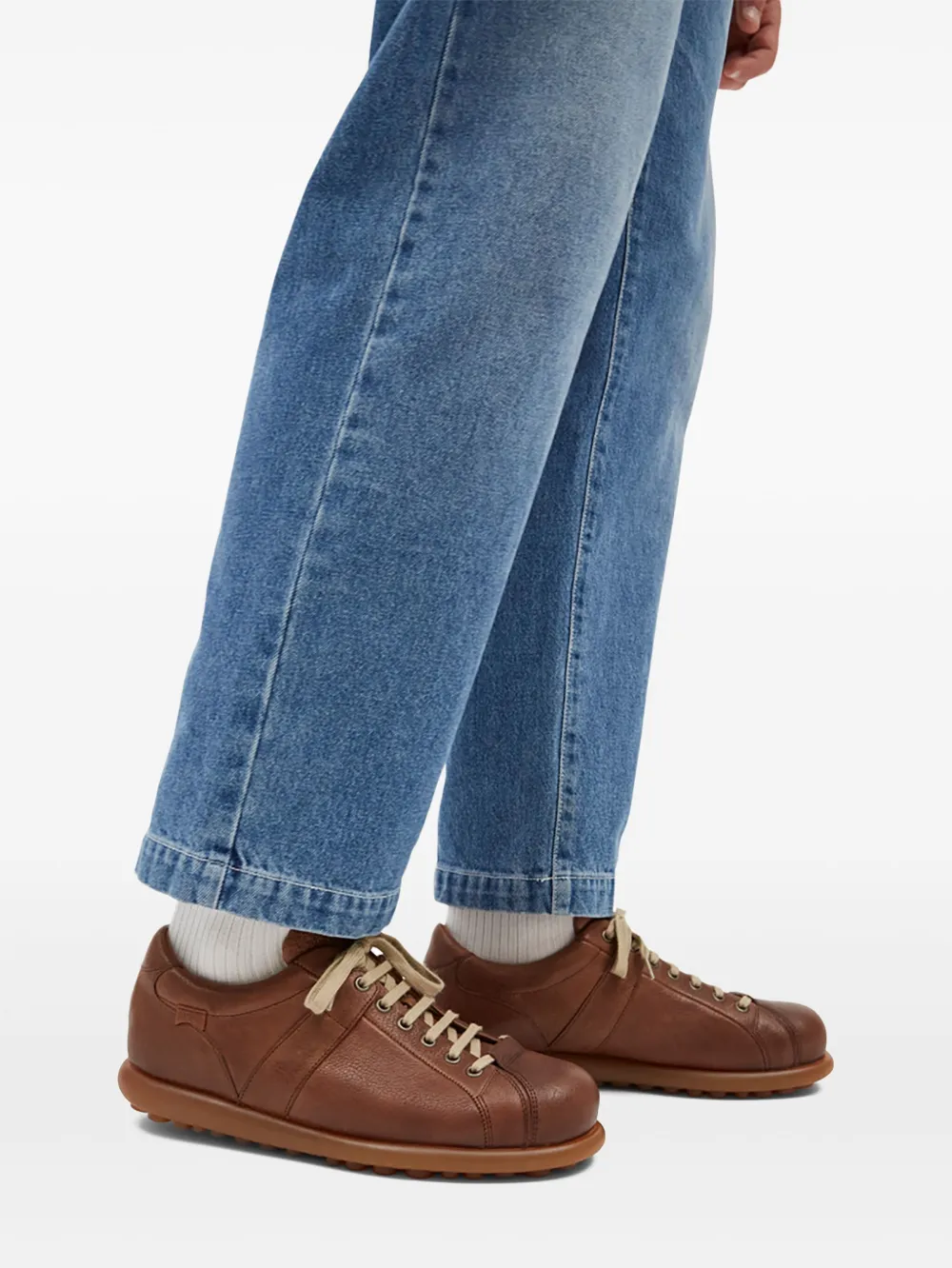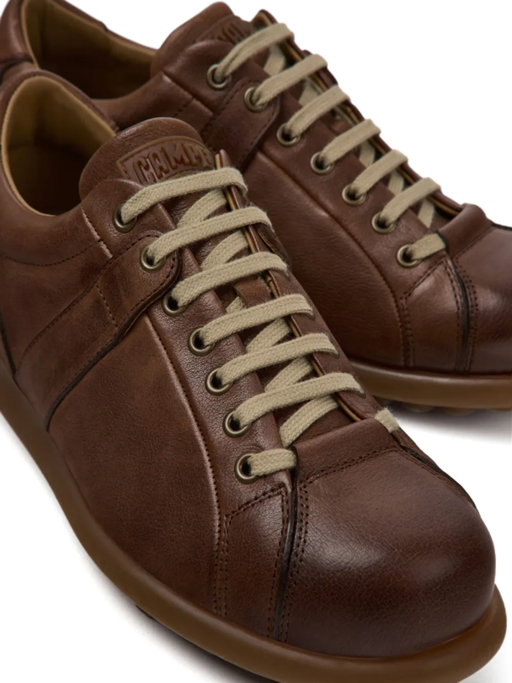 Серо-коричневый, телячья кожа, нашивка с логотипом сбоку, шнуровка спереди, стелька с логотипом, плоская подошва и закругленный носок.