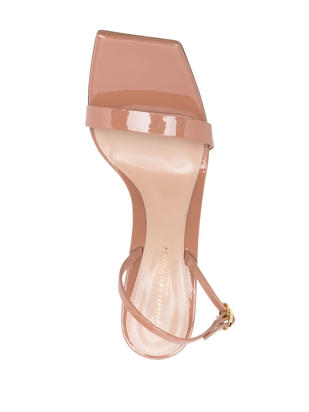 Миндальный, телячья кожа, лакированная отделка, кожаная стелька с логотипом, ремешок на палец, квадратный носок, открытый носок и застежка на пряжке с логотипом.