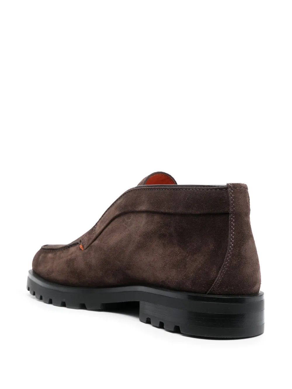 Кофейный, замша из телячьей кожи, вставки, миндалевидный носок, кожаная стелька с логотипом, рифленая резиновая подошва и модель без застежки.
